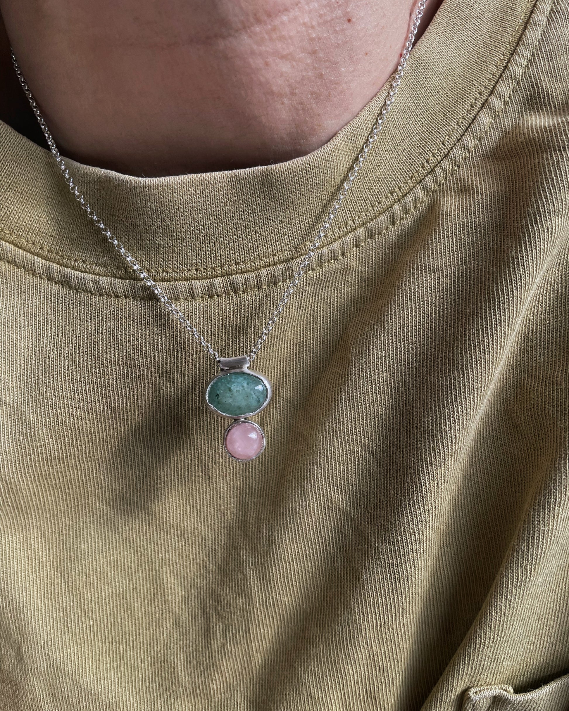 The Ariadne pendant is a delicate handmade piece crafted in sterling silver 925, featuring a harmonious combination of aventurine and rose quartz.