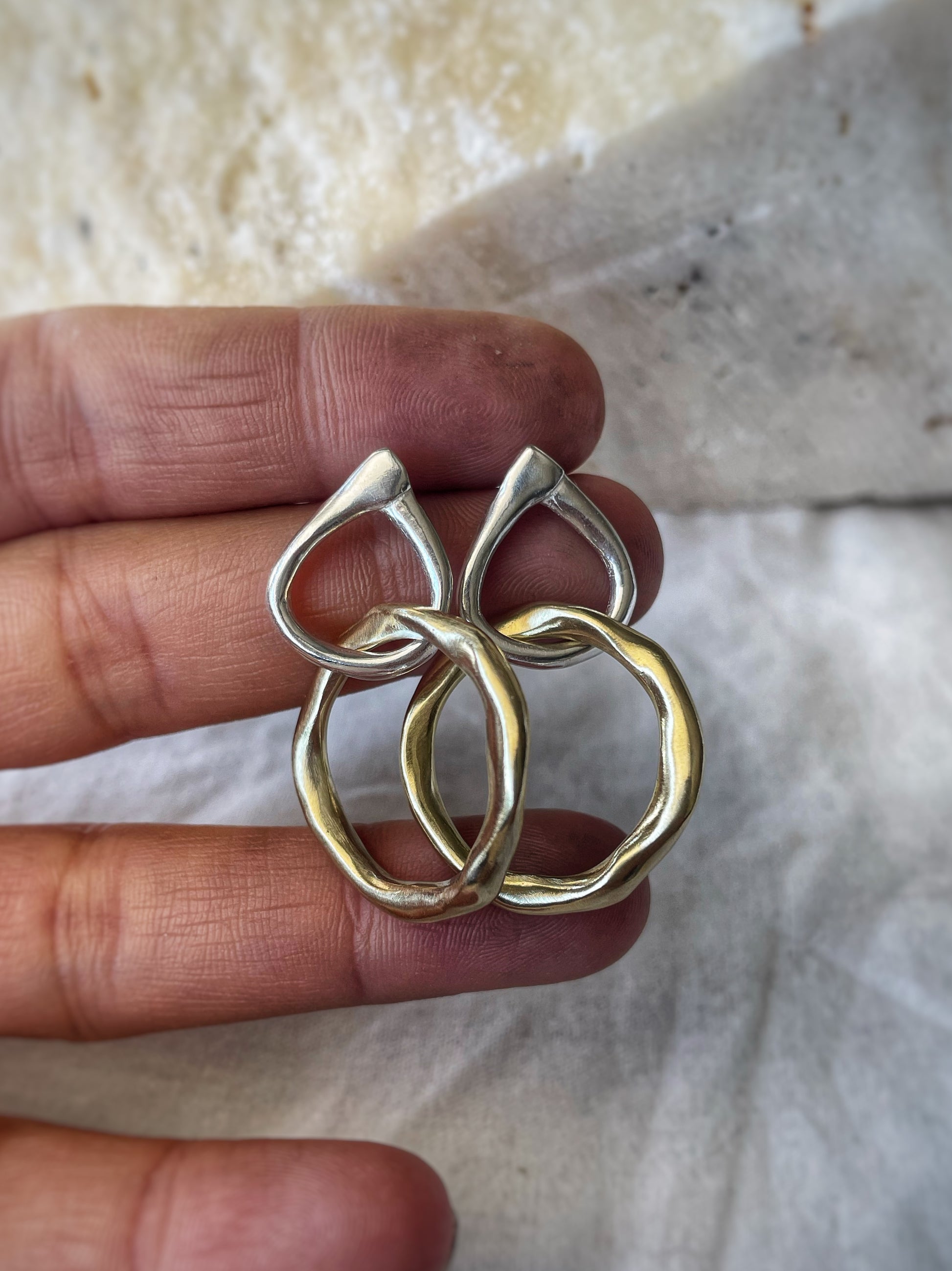 Material: Smaller hoop in 925 sterling silver, larger irregular hoop in brass
