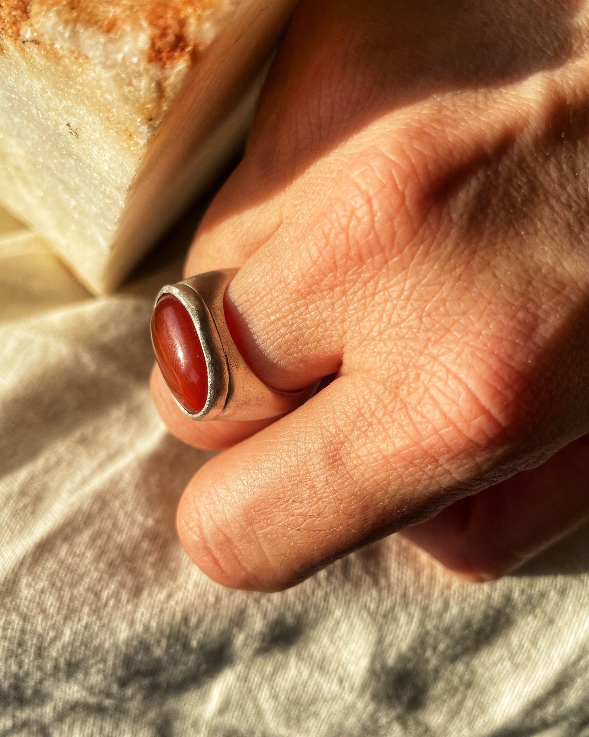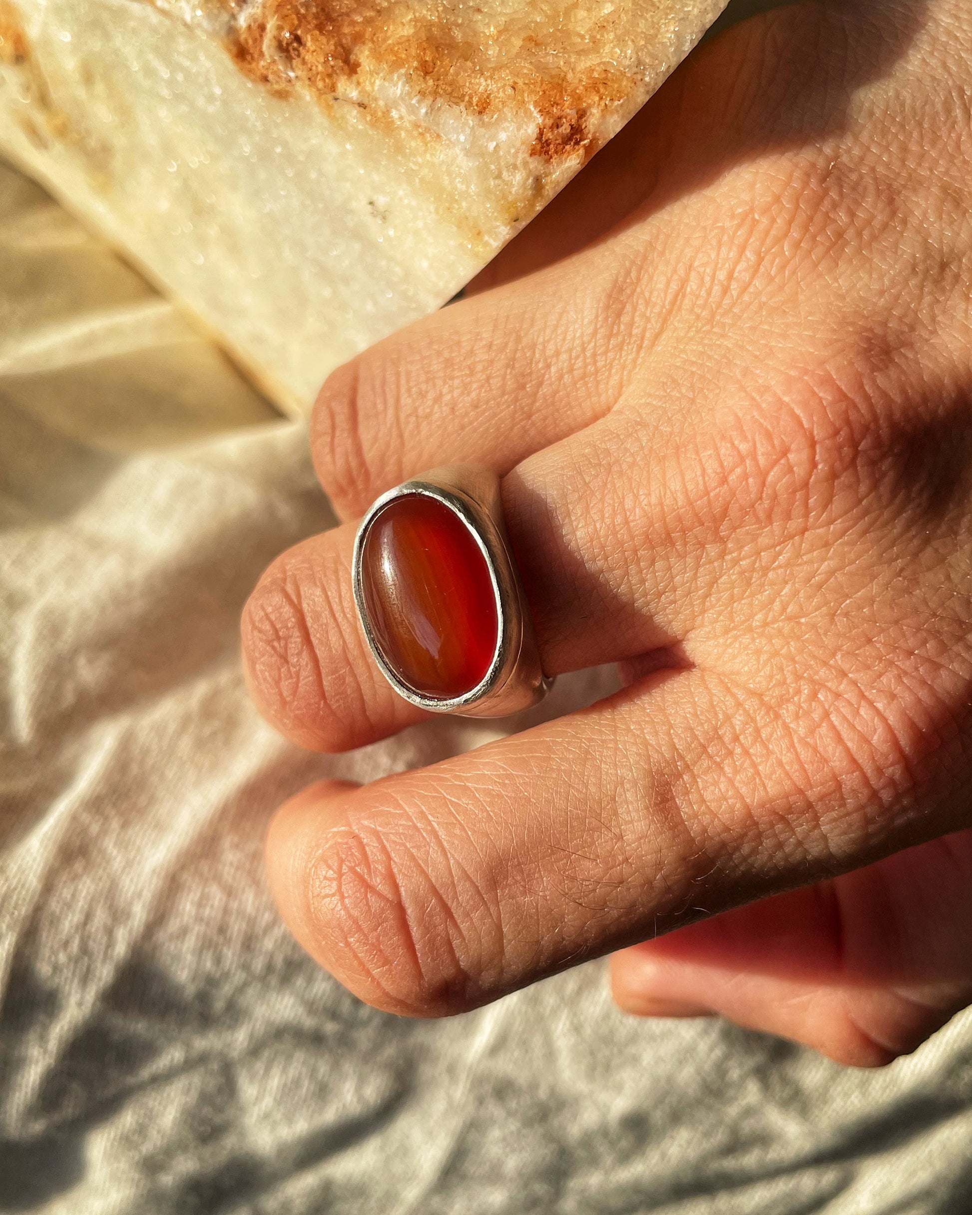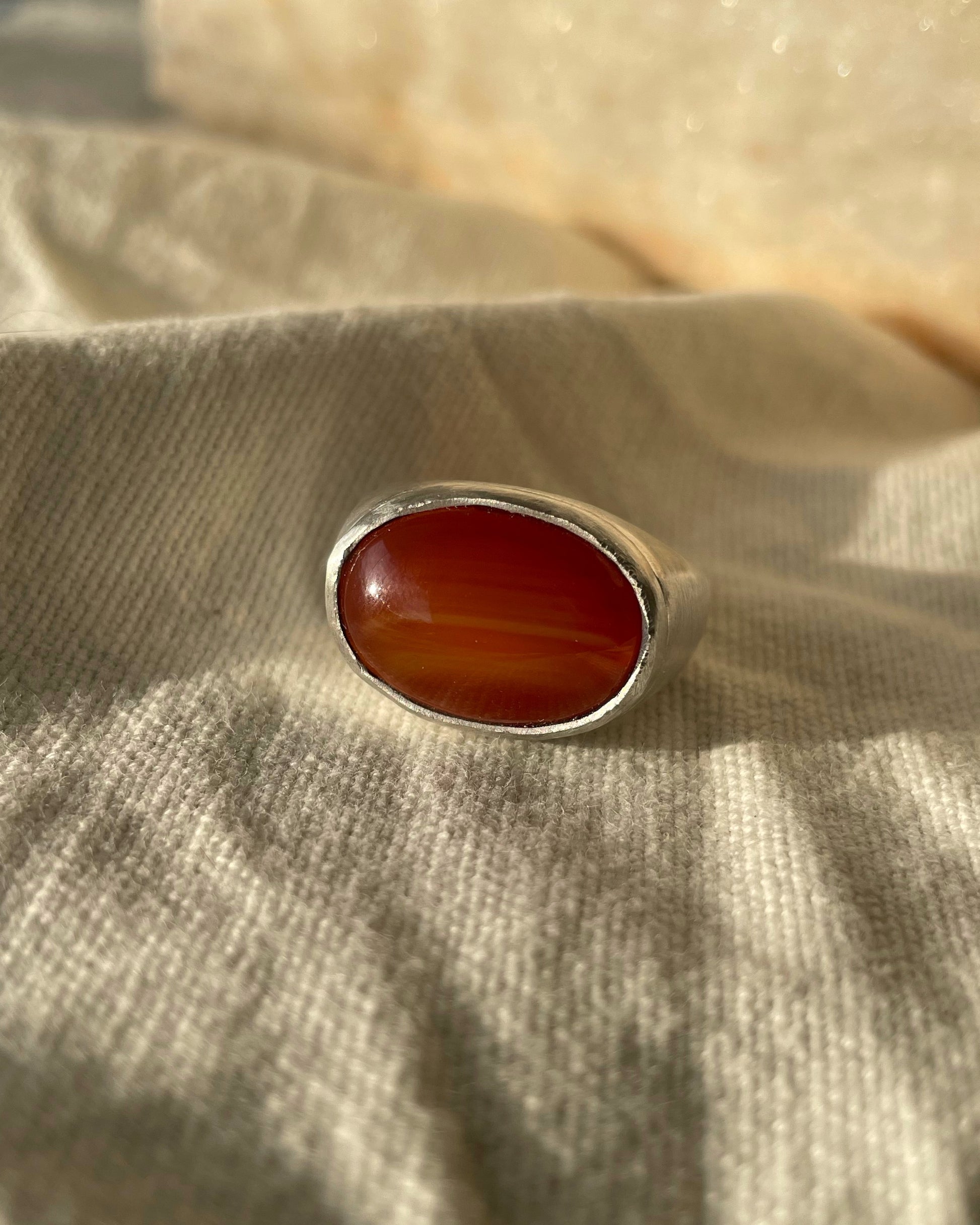 A statement ring handcrafted in sterling silver 925, set with a warm-toned natural carnelian gemstone. A bold yet grounded piece of handmade silver jewelry inspired by raw materials and natural textures.