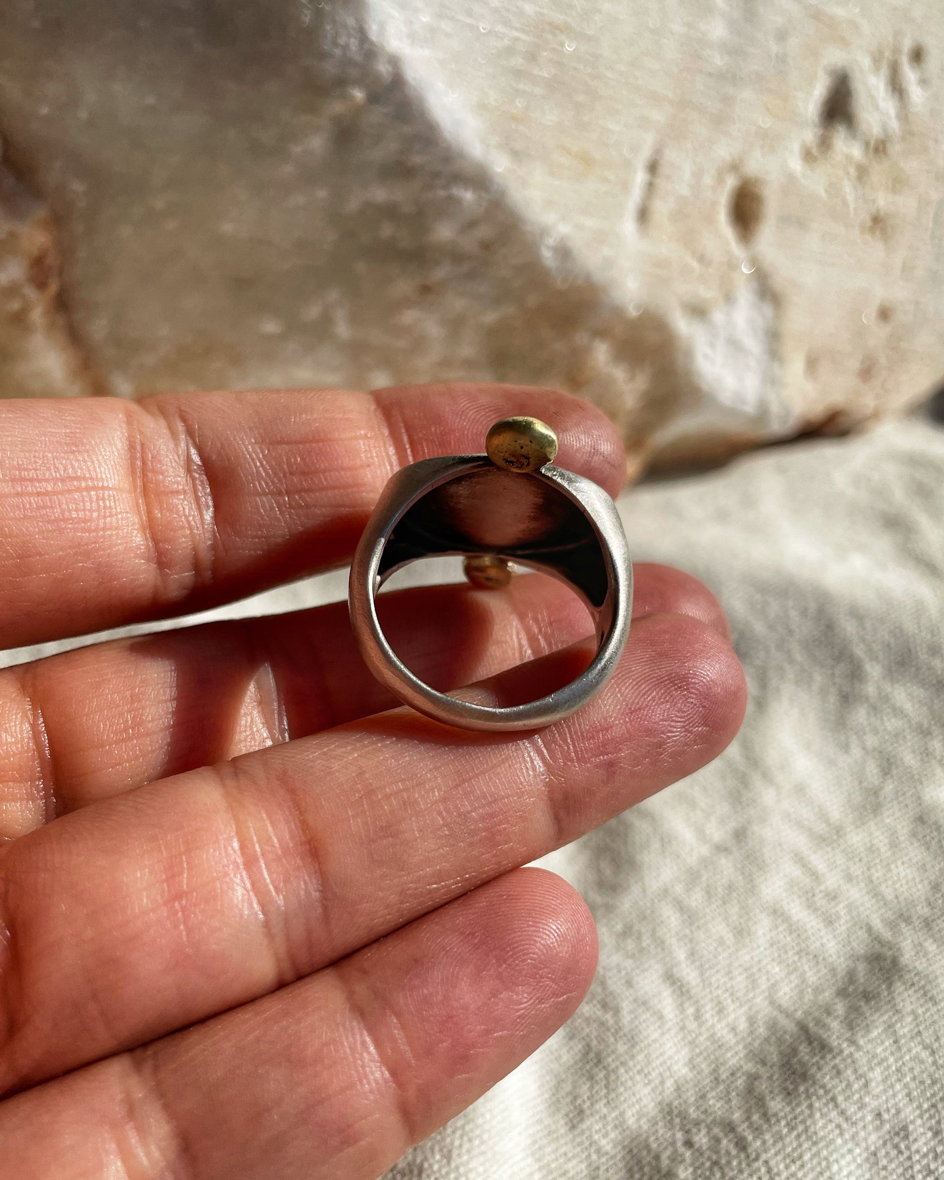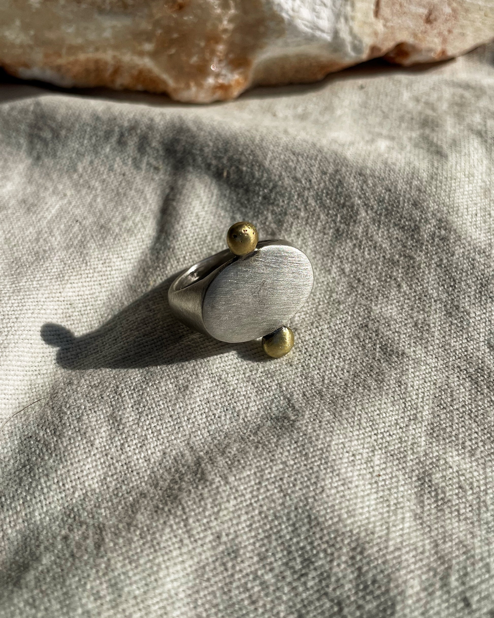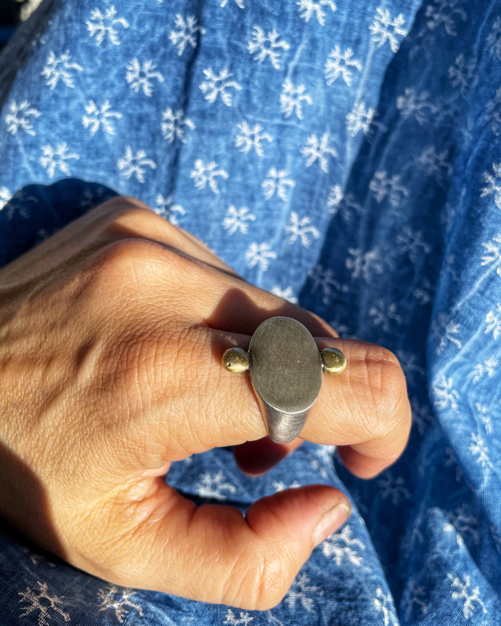 A handcrafted sterling silver ring with an oval, flat face, accented with two brass granules placed on opposite ends. Its matte finish and hand-etched markings give it a raw, vintage character, evoking the feeling of an ancient relic. Each piece is individually handmade, making every ring uniquely different from the next.