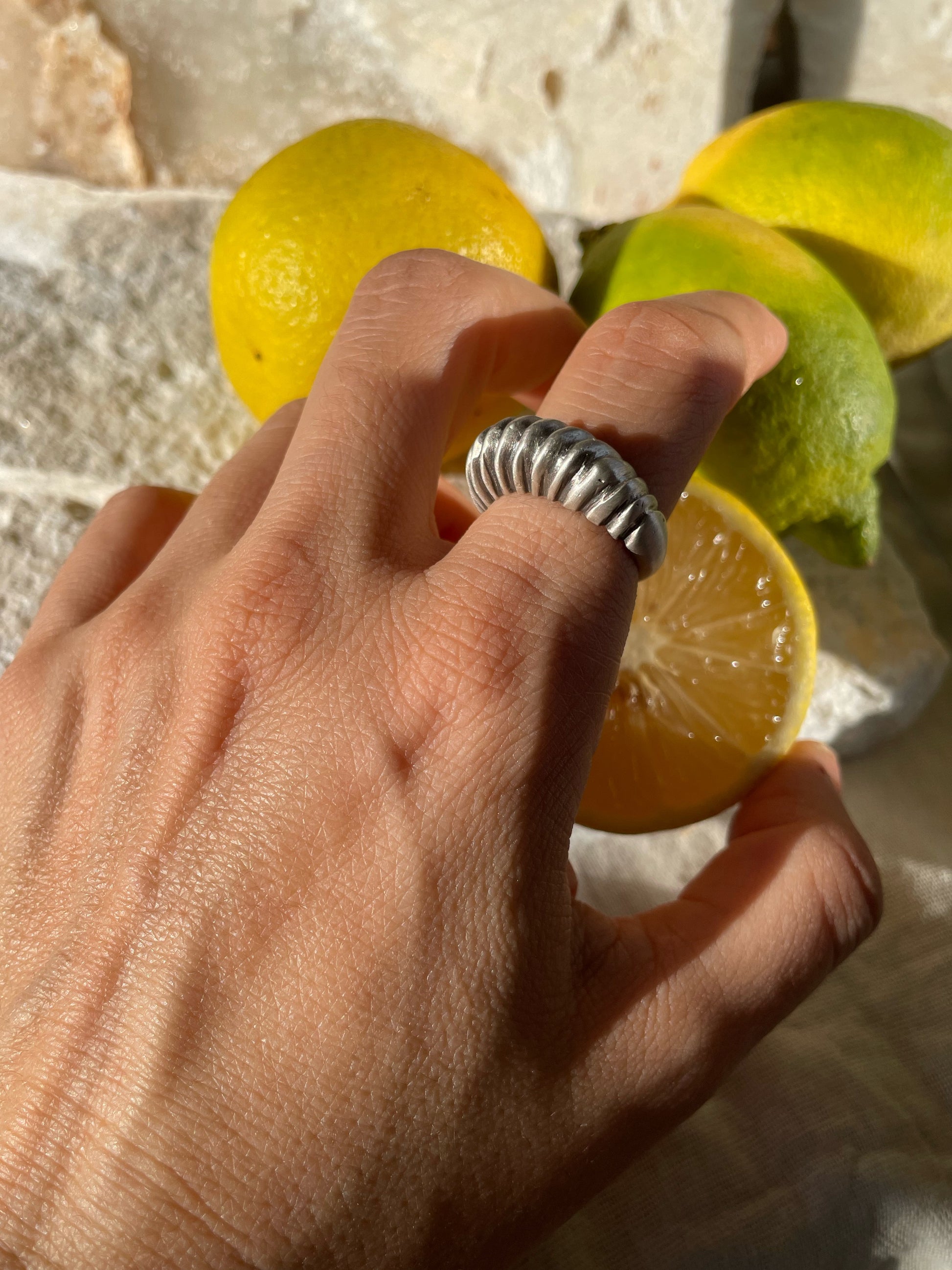 This solid sterling silver chunky dome ring features a bold, sculptural design with a croissant twisted effect, making it the perfect statement ring. Choose between a matte or shiny finish to match your style.