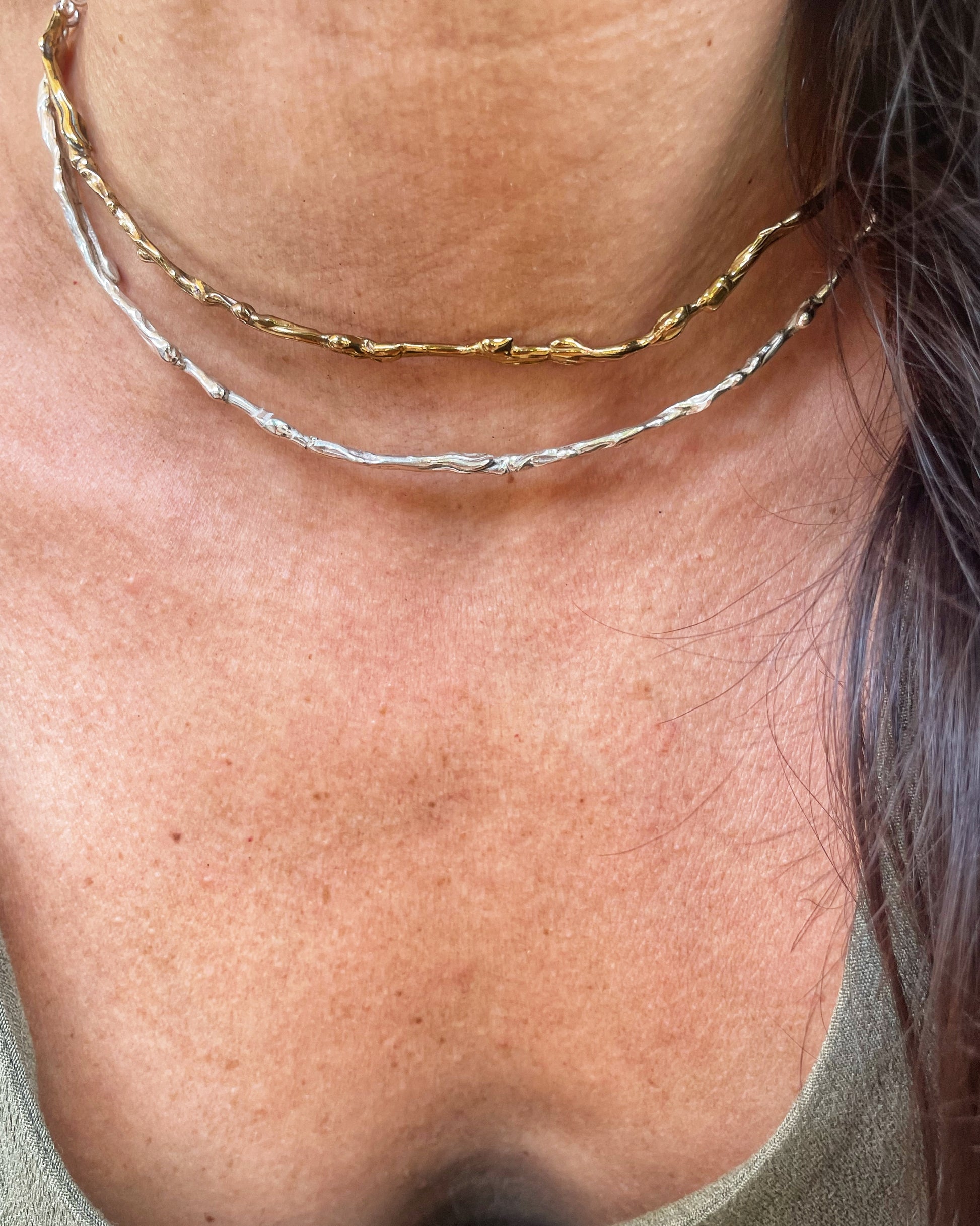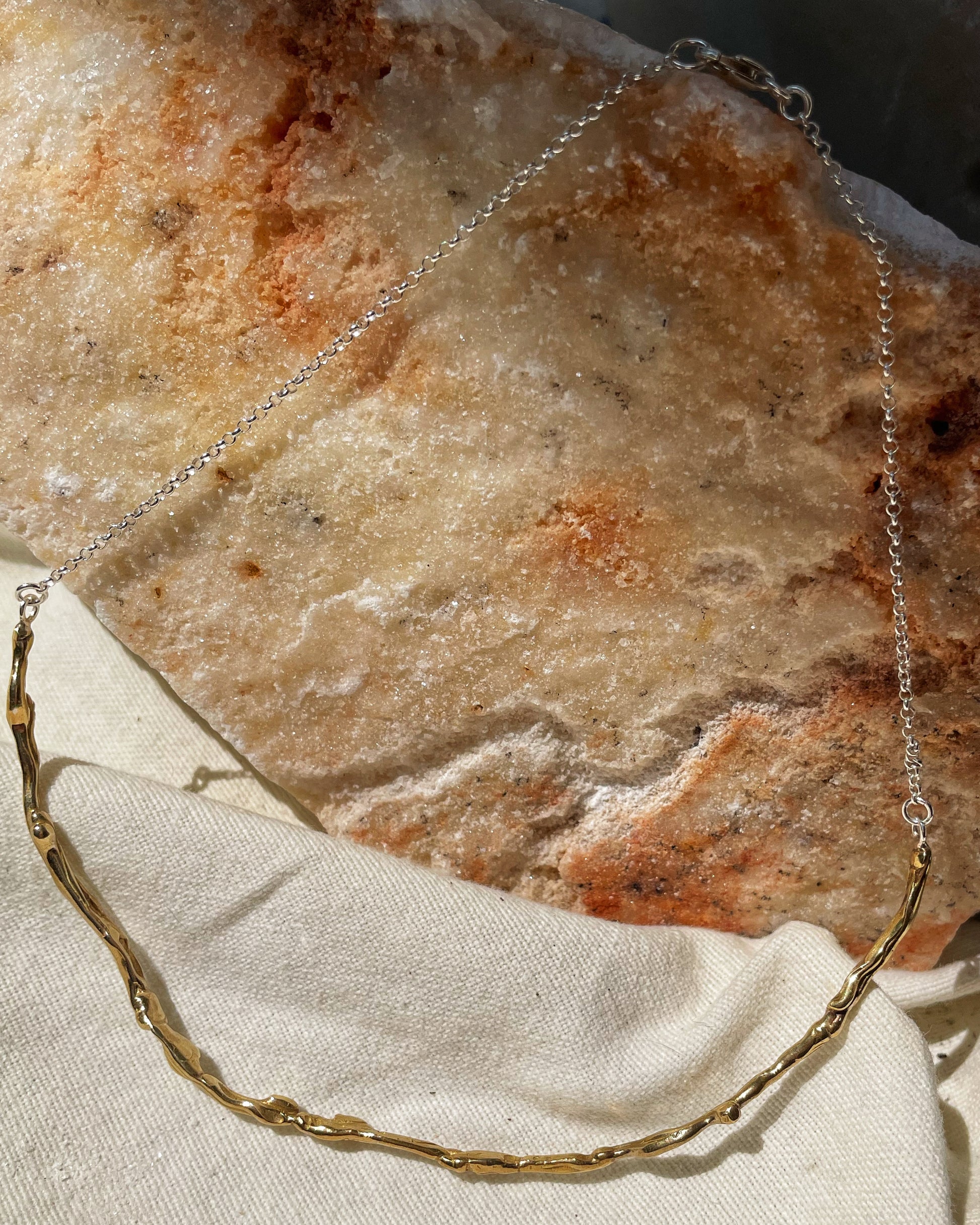 This handmade necklace blends minimal design with raw, organic beauty. A sculpted brass element is paired with a delicate 925 sterling silver chain, creating a timeless piece with a vintage-inspired feel. Its textured finish adds character, making it perfect for layering or wearing as a subtle statement on its own. Entirely handcrafted, each necklace is unique.