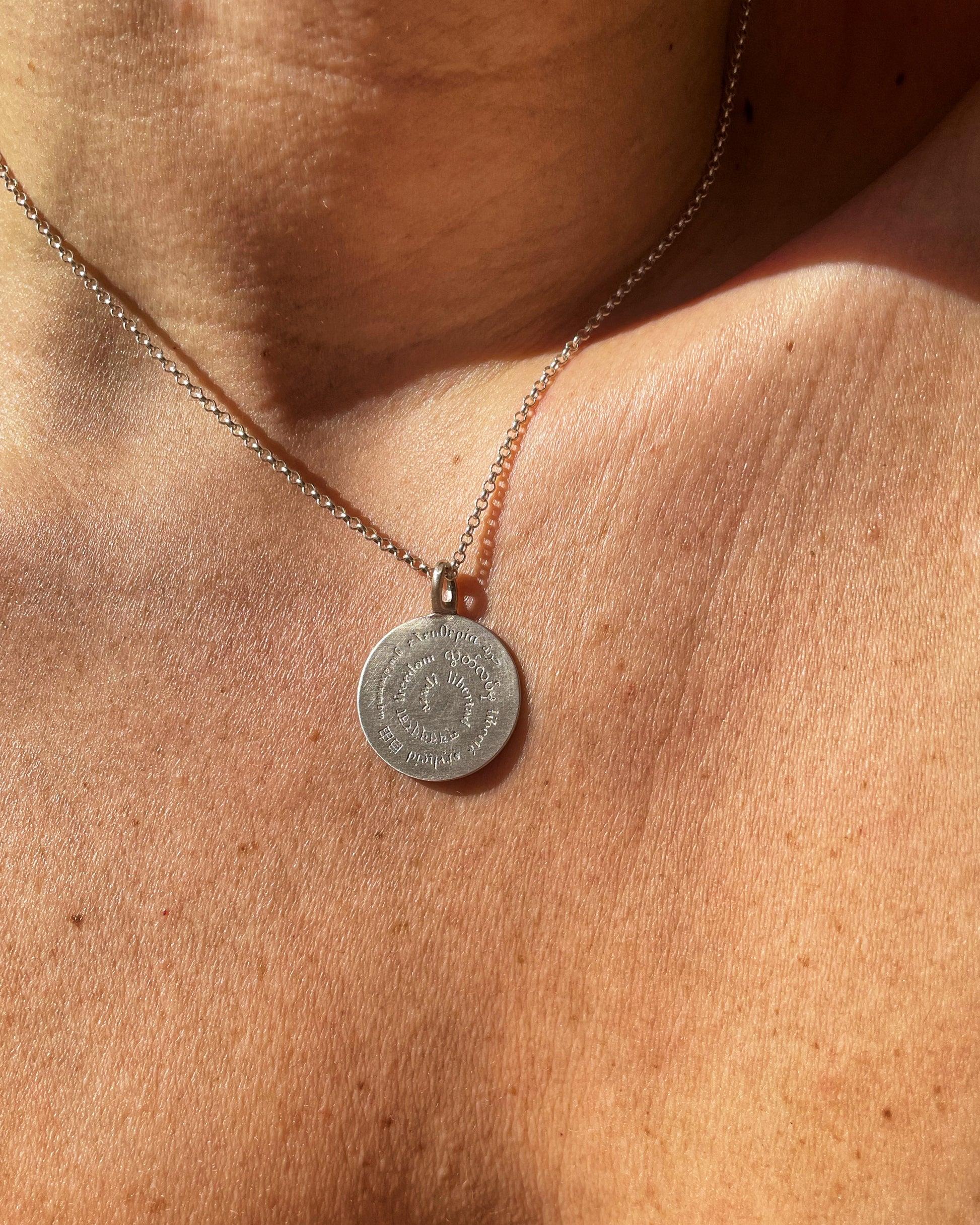 A meaningful, handcrafted silver pendant engraved with the word “Freedom” in 9 different languages: Ελευθερία, حرية, თავისუფლება, liberté, libertad, libertà, 自由, freedom, Freiheit.
