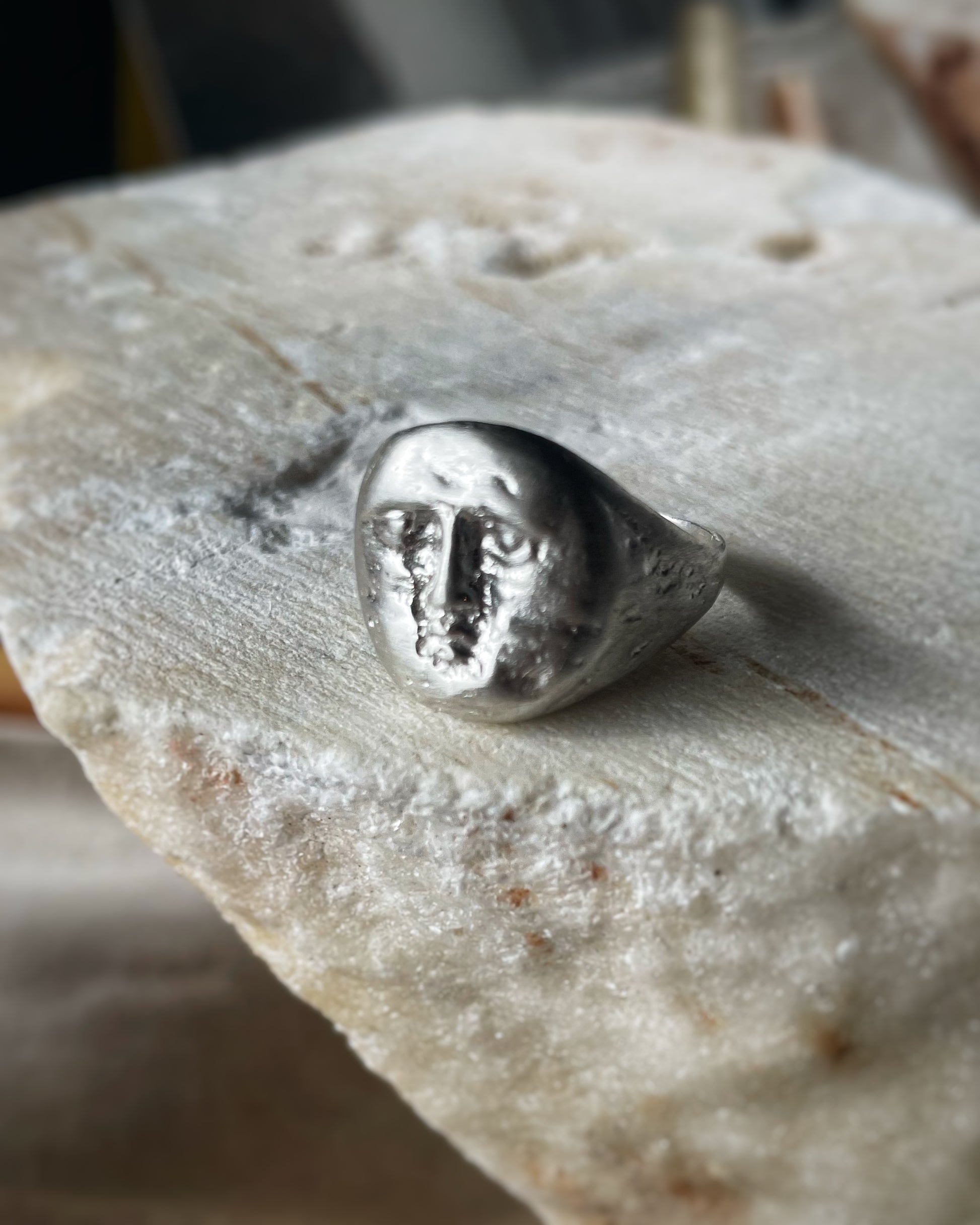 A sculptural full moon ring, hand engraved and shaped to preserve the raw character of the metal.
