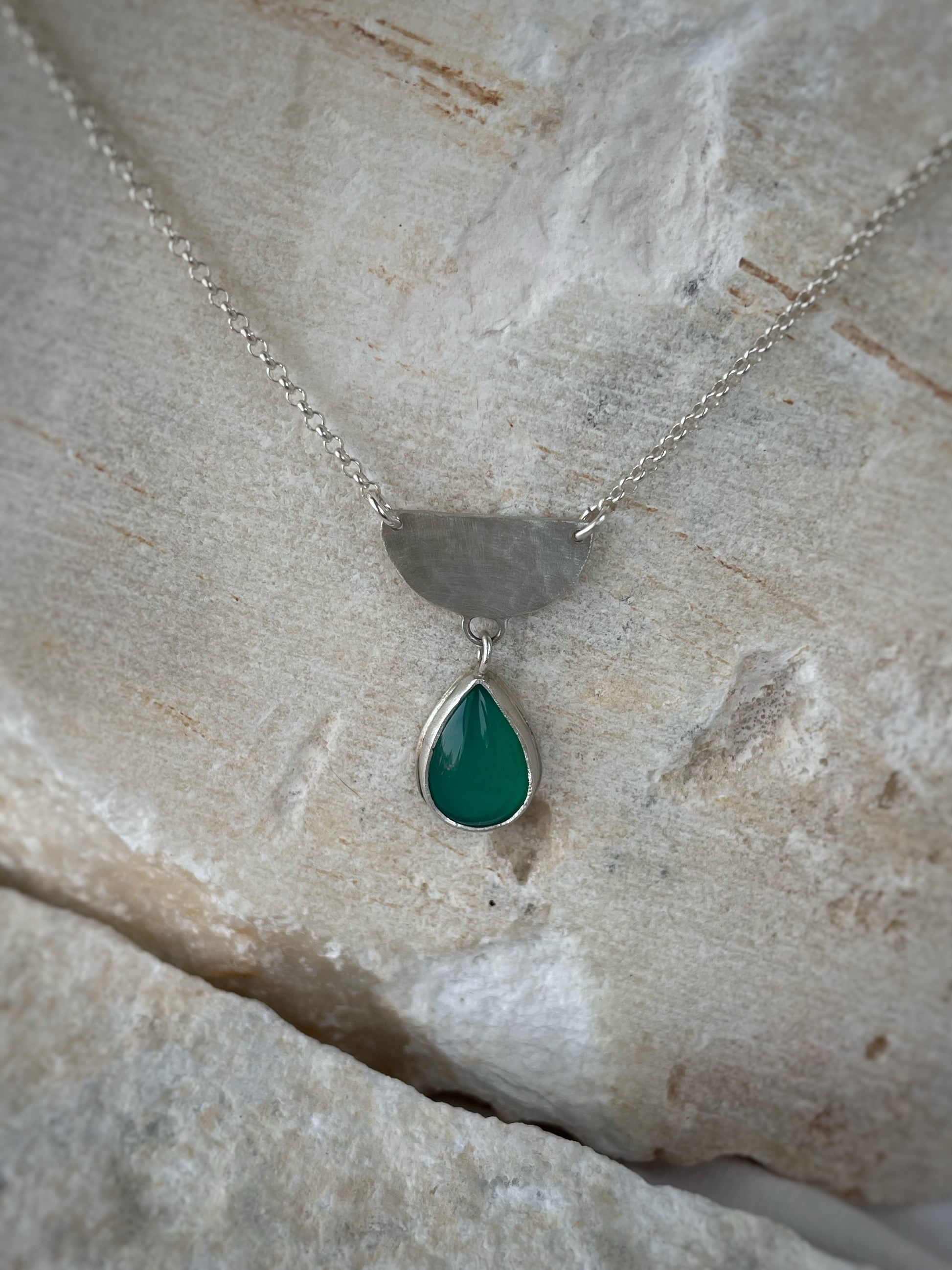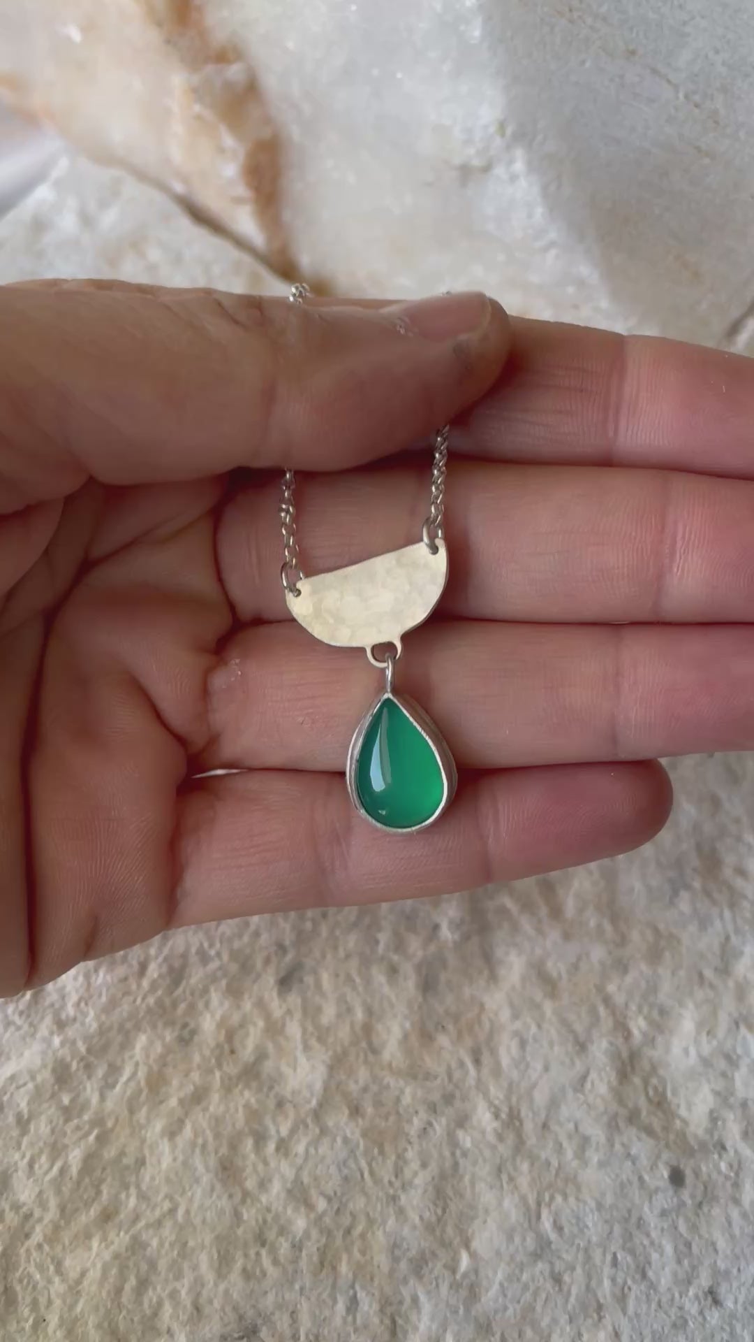 A unique 925 sterling silver necklace featuring a teardrop-shaped Green Agate stone paired with a hand-forged half-circle pendant. This minimalist yet elegant design is perfect for everyday wear or special occasions.