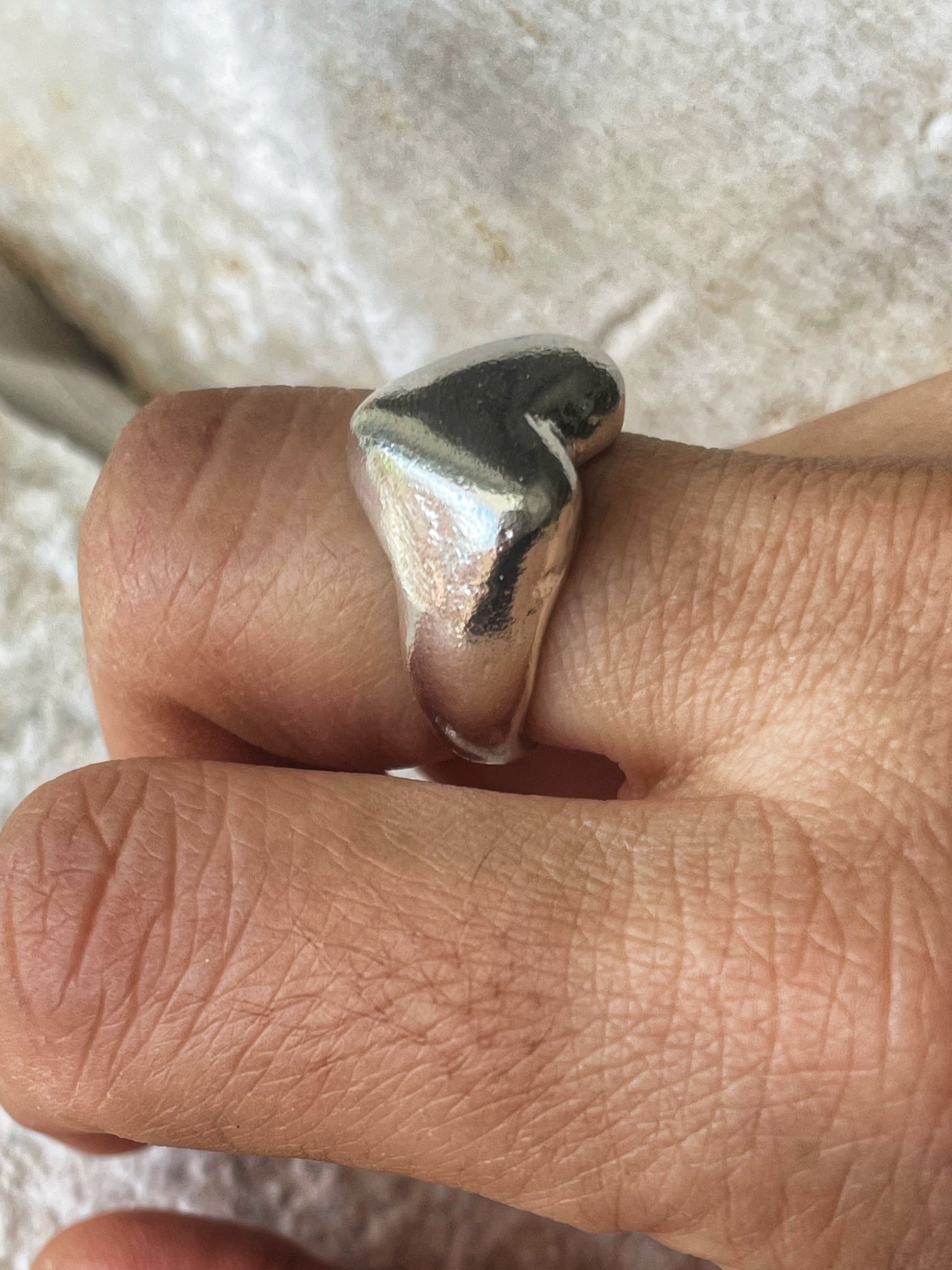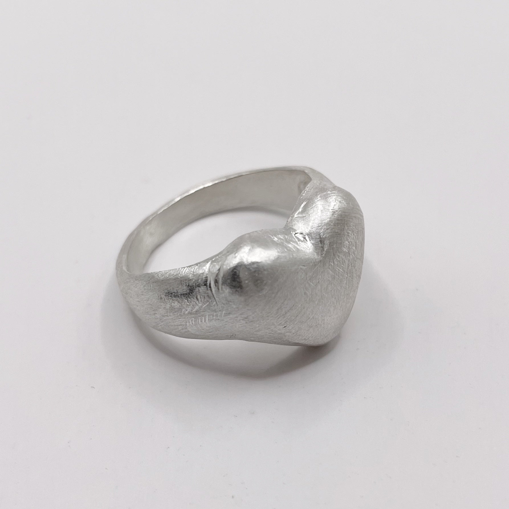 This statement Heart ring features a matte finish, with intentional lines, scars, and natural imperfections that make each piece one of a kind. Crafted from solid 925 sterling silver, this minimalist dome ring combines elegance with an organic, handcrafted feel.