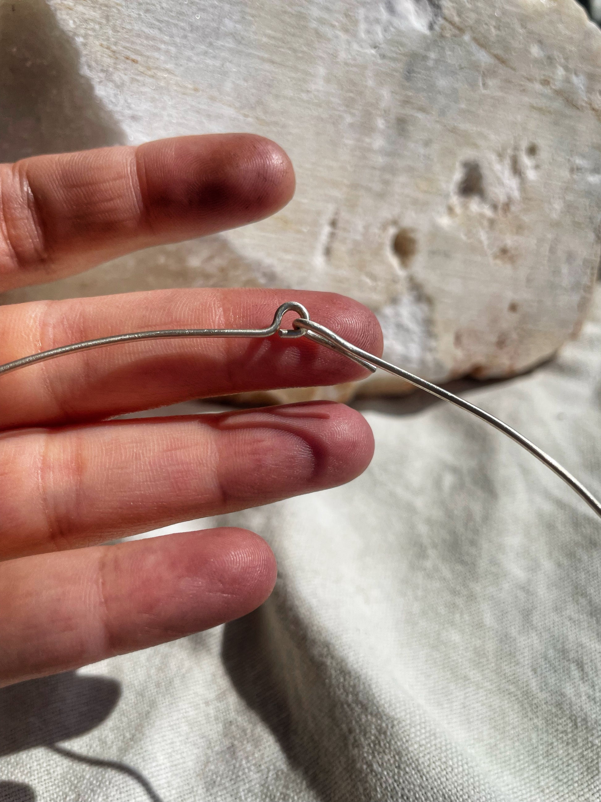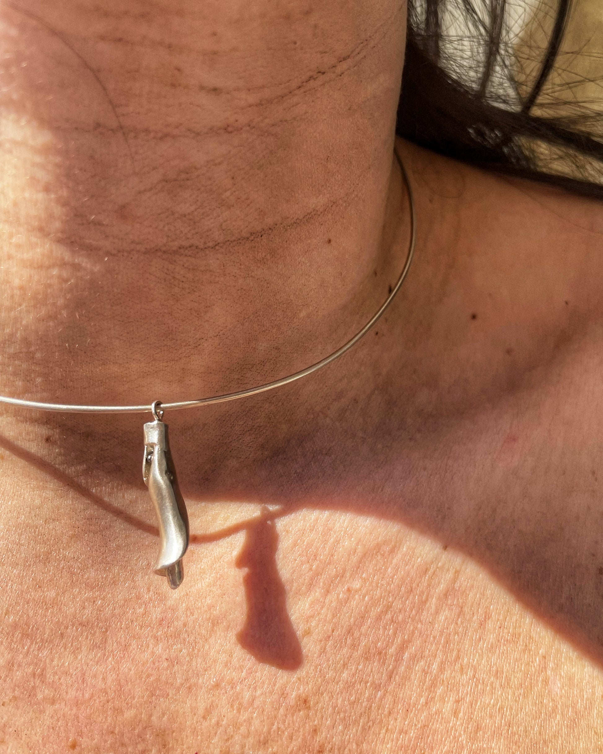 A handcrafted sterling silver wire choker featuring a delicate, nature-inspired cast seashell pendant. Minimal and elegant, this piece evokes the raw beauty of the sea, making it a perfect statement for ocean lovers.
