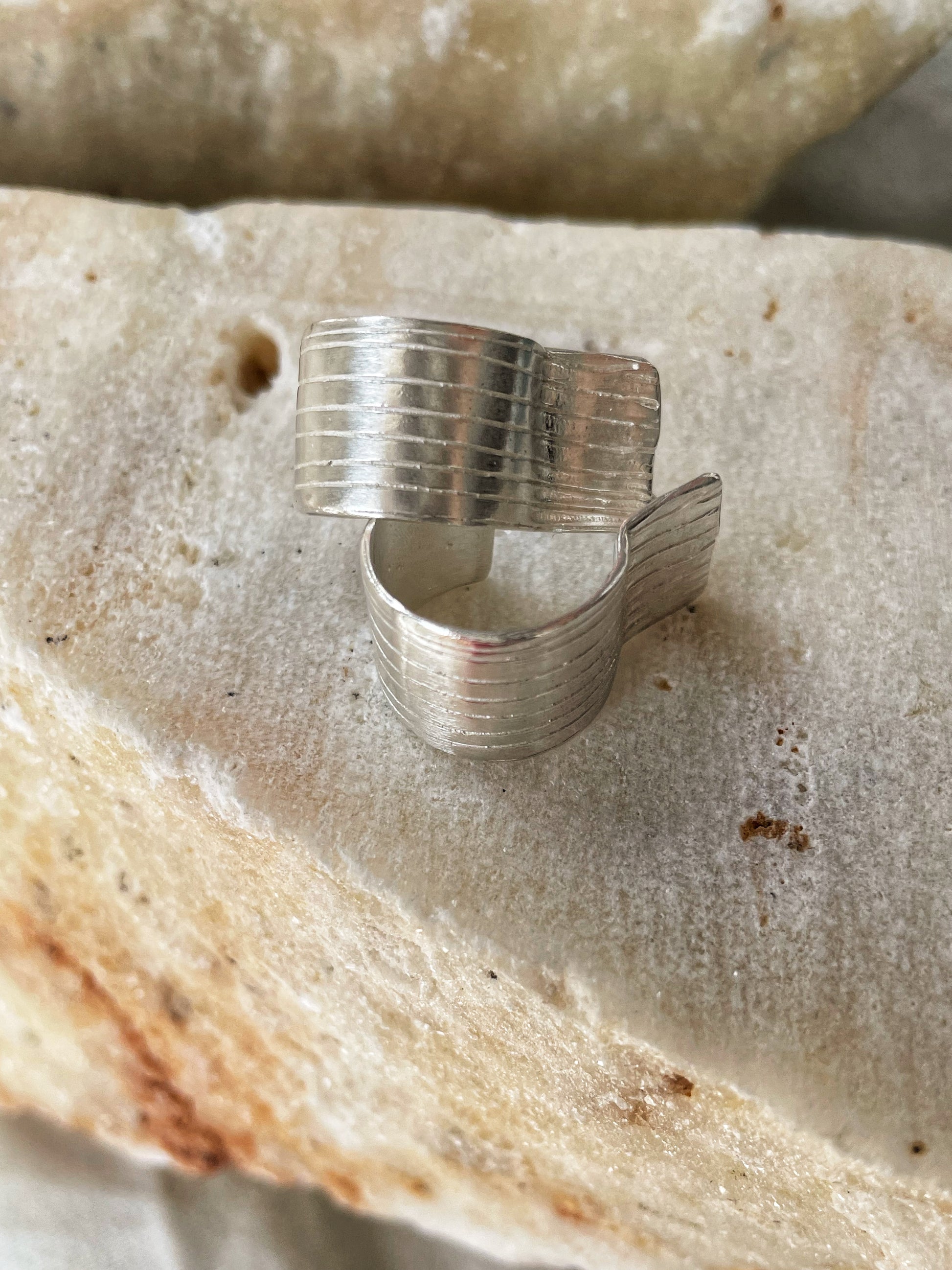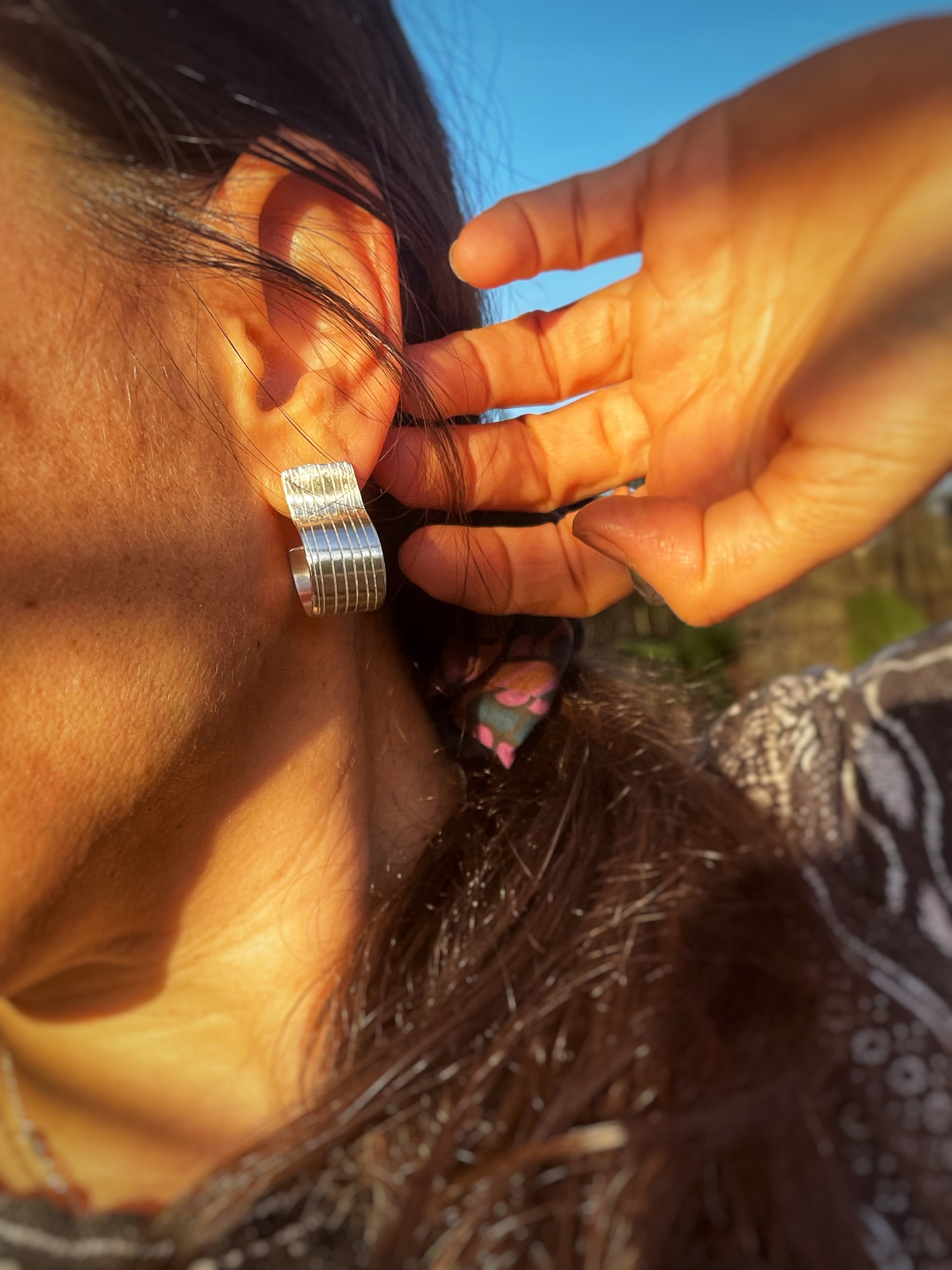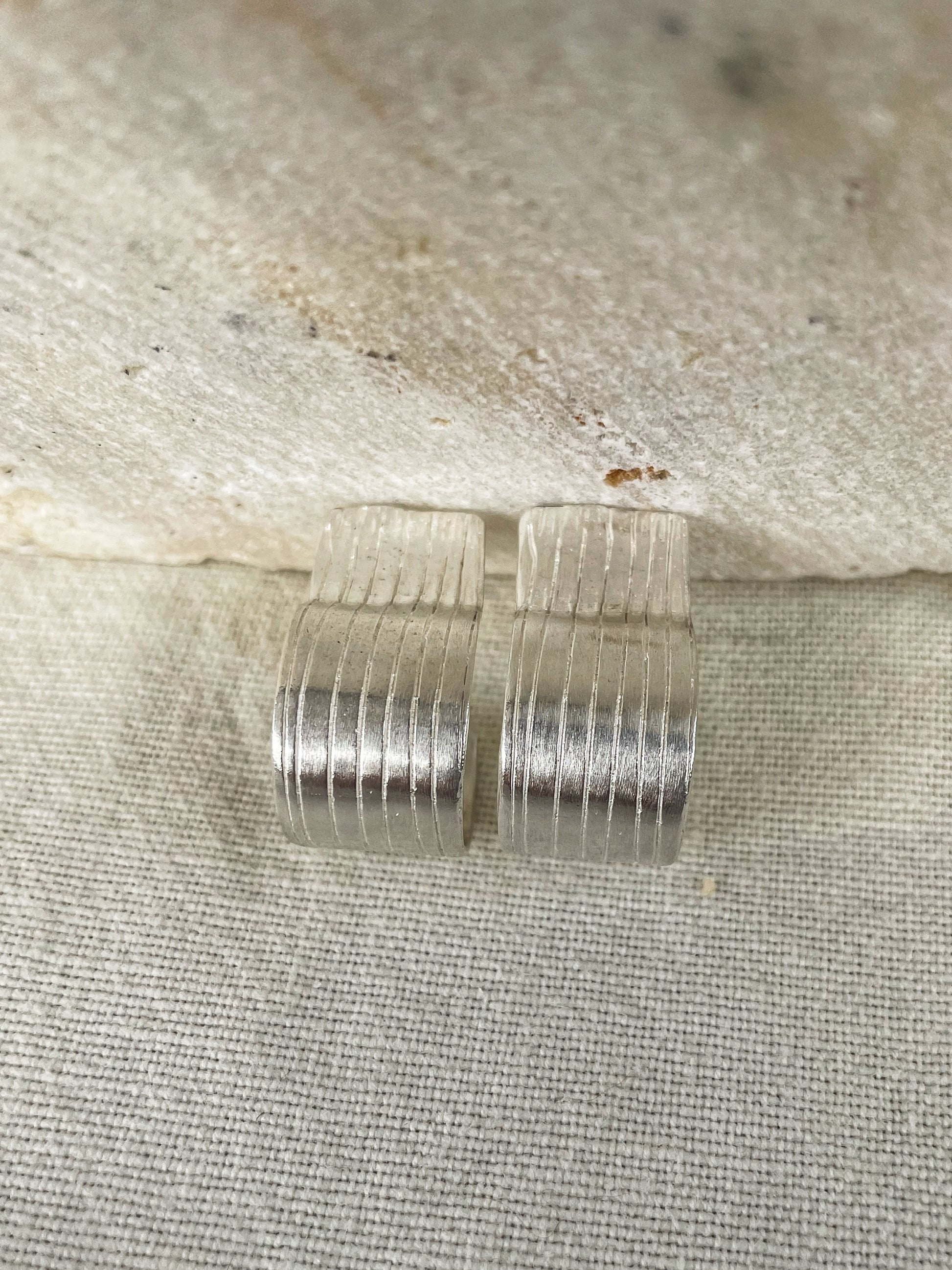 Elegant handmade Sterling Silver earrings with engraved lines — a delicate yet sculptural statement.