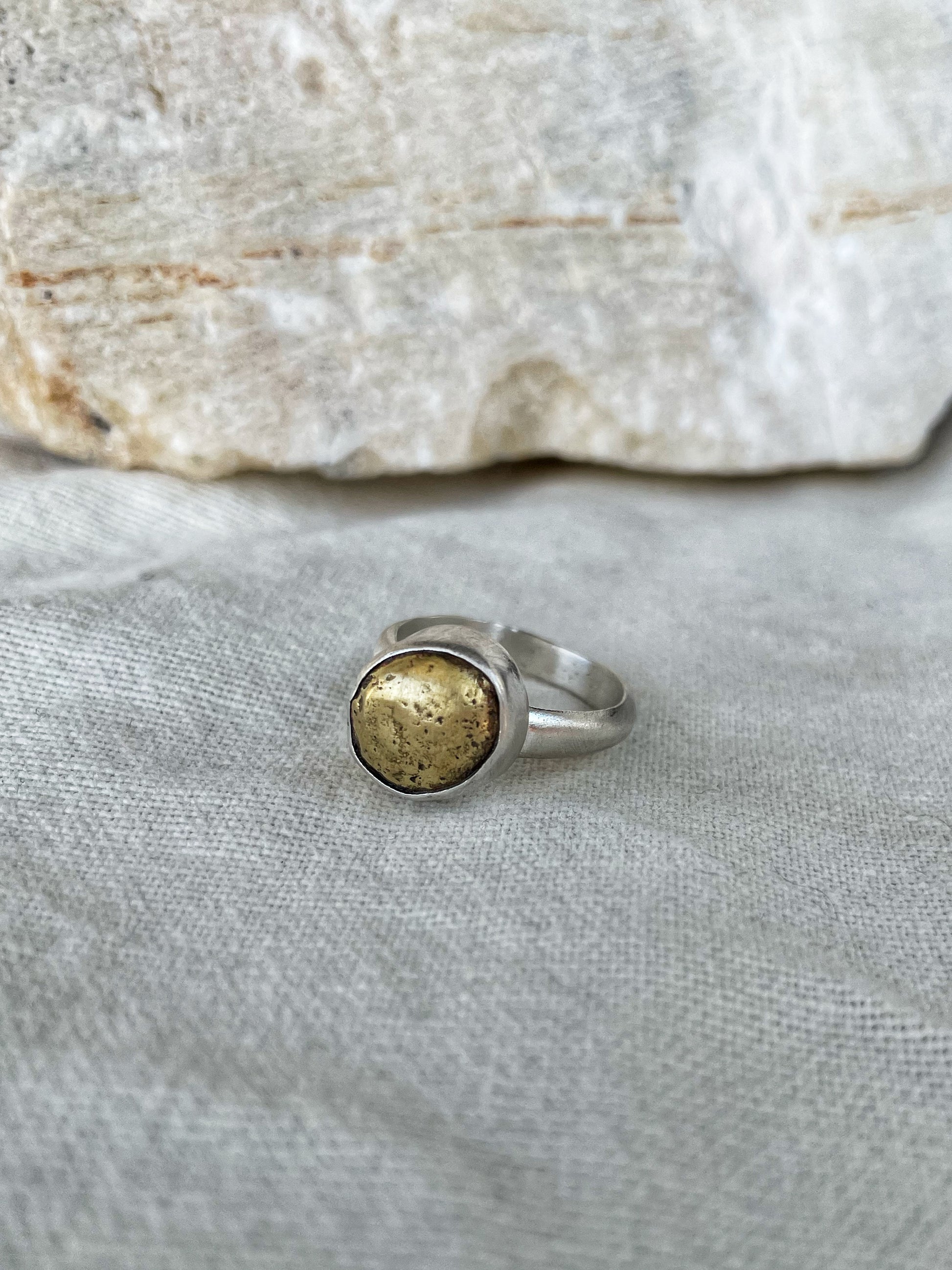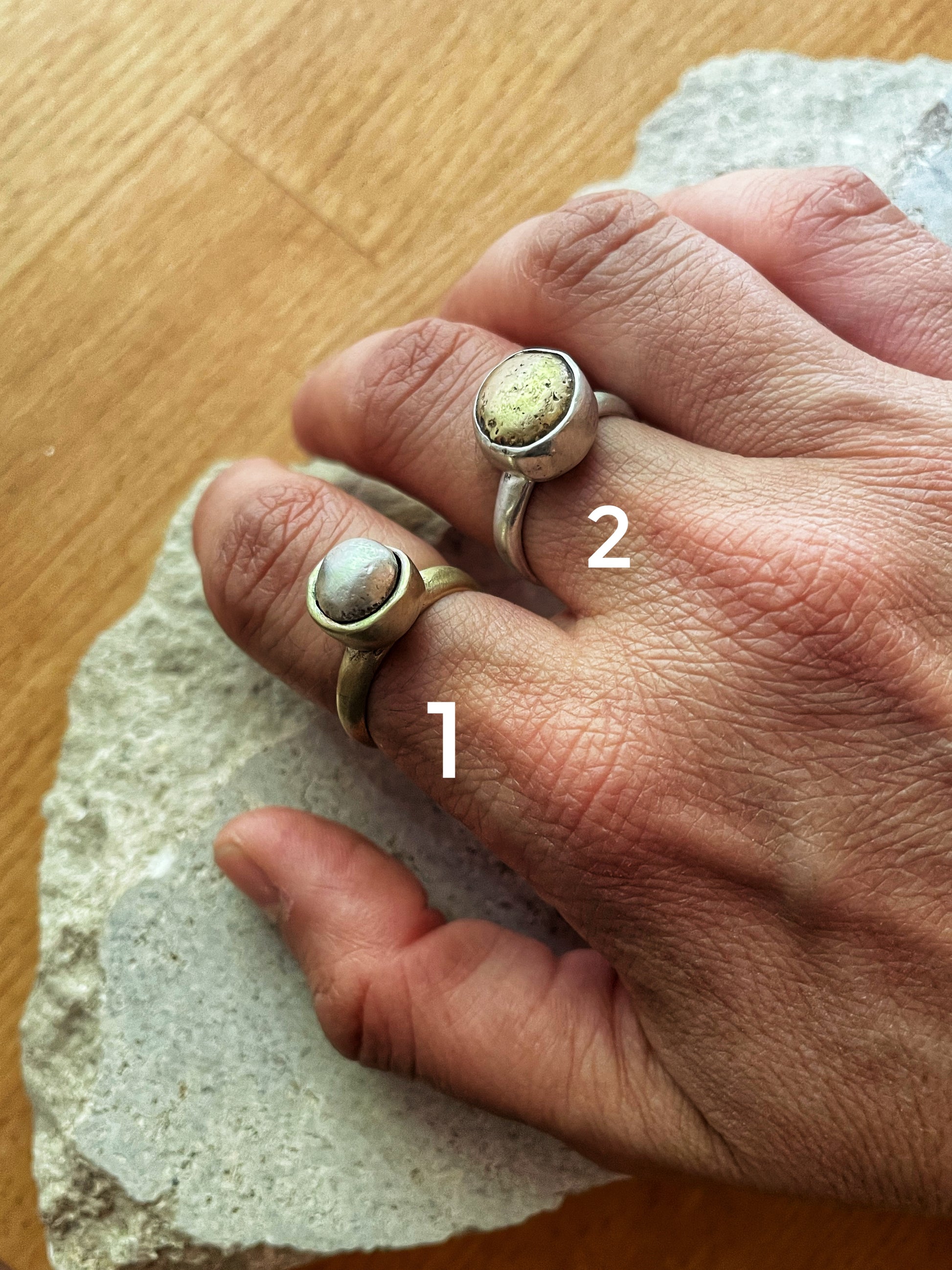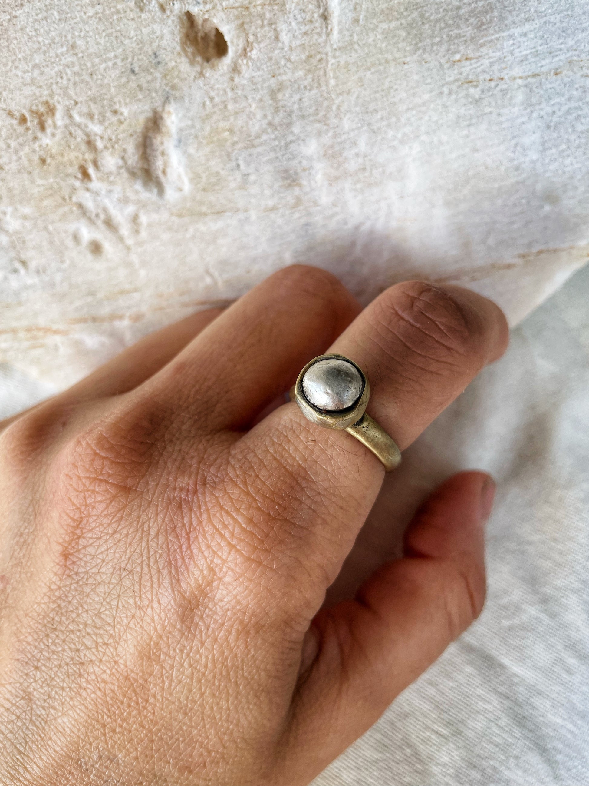 Two one-of-a-kind, handcrafted rings combining sterling silver and bronze in a natural, organic design. The unique mixed metal contrast and polished finish make them bold yet minimal statement pieces.