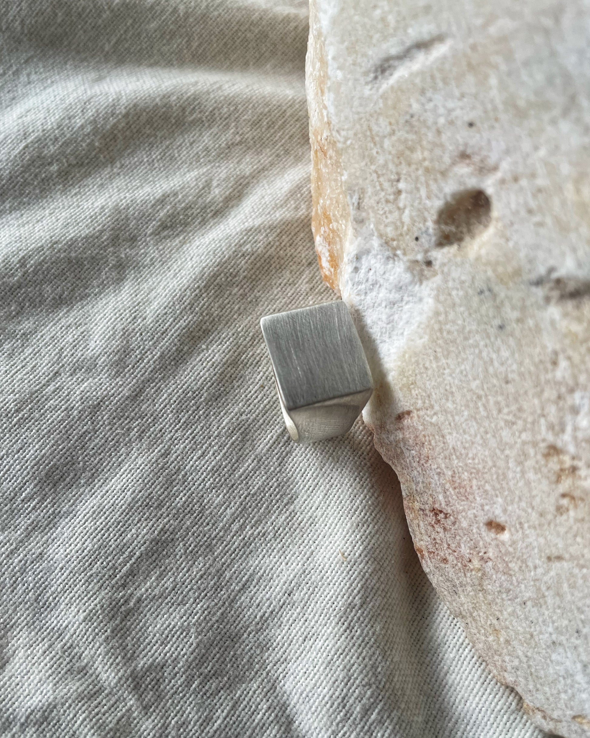 A handcrafted square sterling silver ring with clean, architectural lines and a bold minimalist shape. Its brushed matte finish creates a soft industrial texture, while the strong geometric silhouette makes it a striking unisex statement piece.