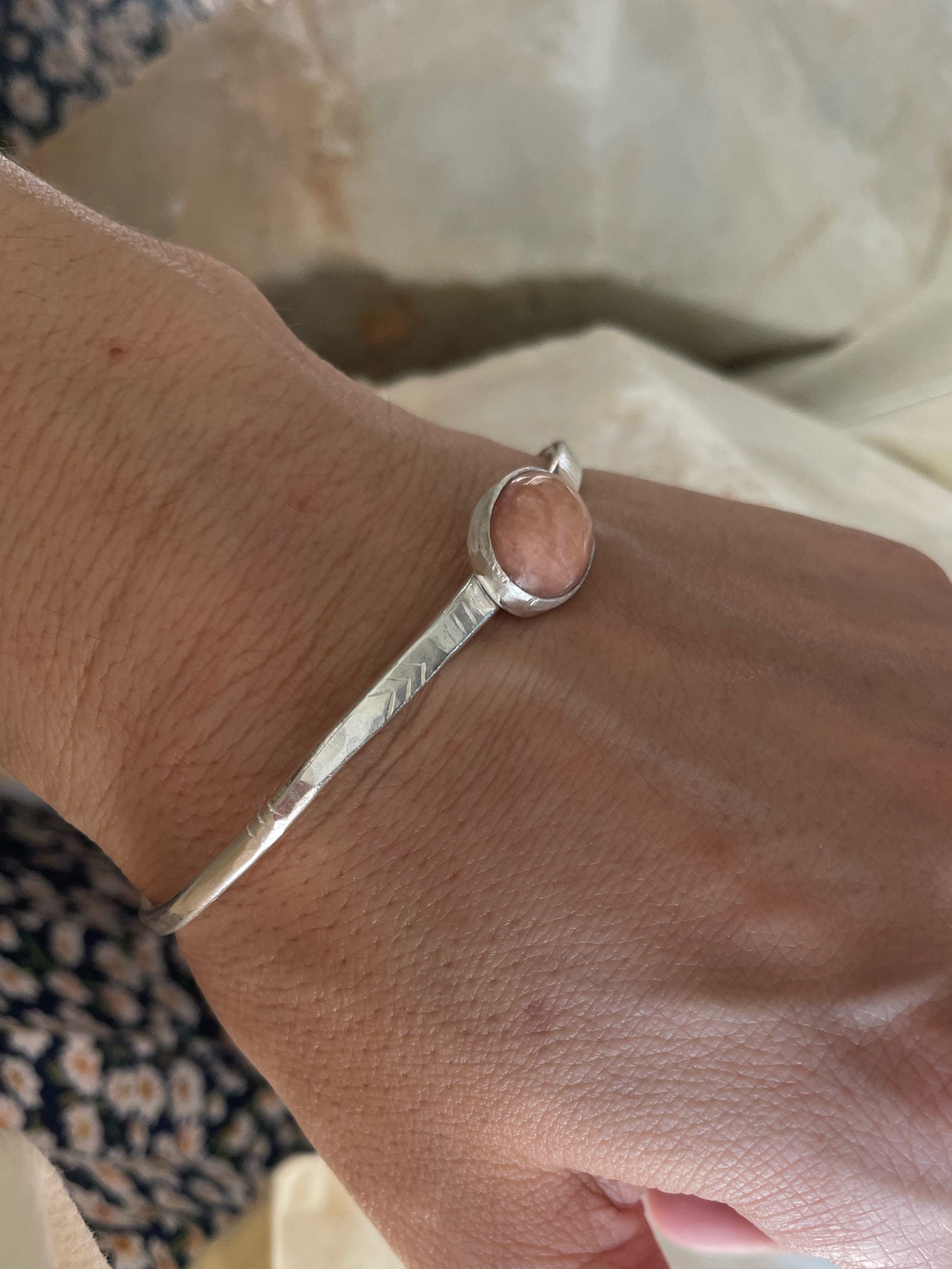 This open bangle features a unique pink calcite stone set in sterling silver. The engraved design adds a subtle detail. Available in matte or shiny finish. A minimalist and boho statement piece.