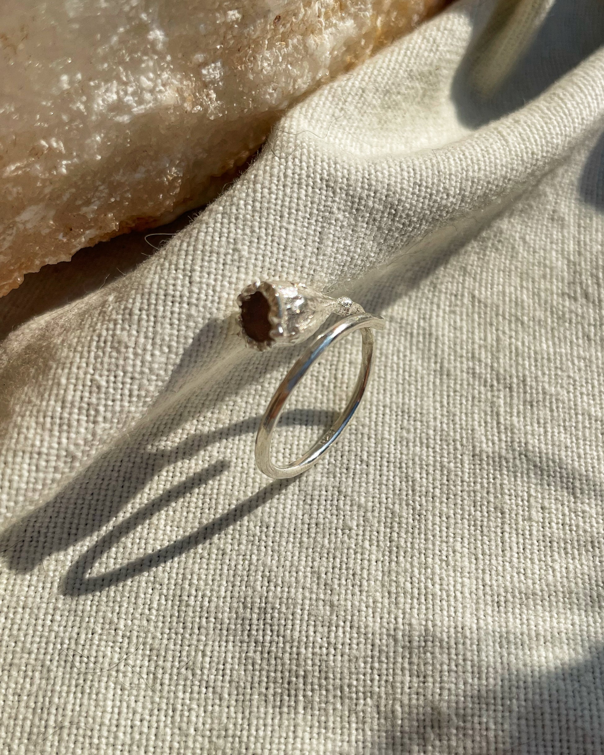 A delicate sterling silver ring inspired by the natural form of a poppy seed. Minimal and raw, this piece is perfect for nature lovers who seek simplicity with meaning. Open and adjustable, but for your convenience, please select your size so I can adjust it for you.