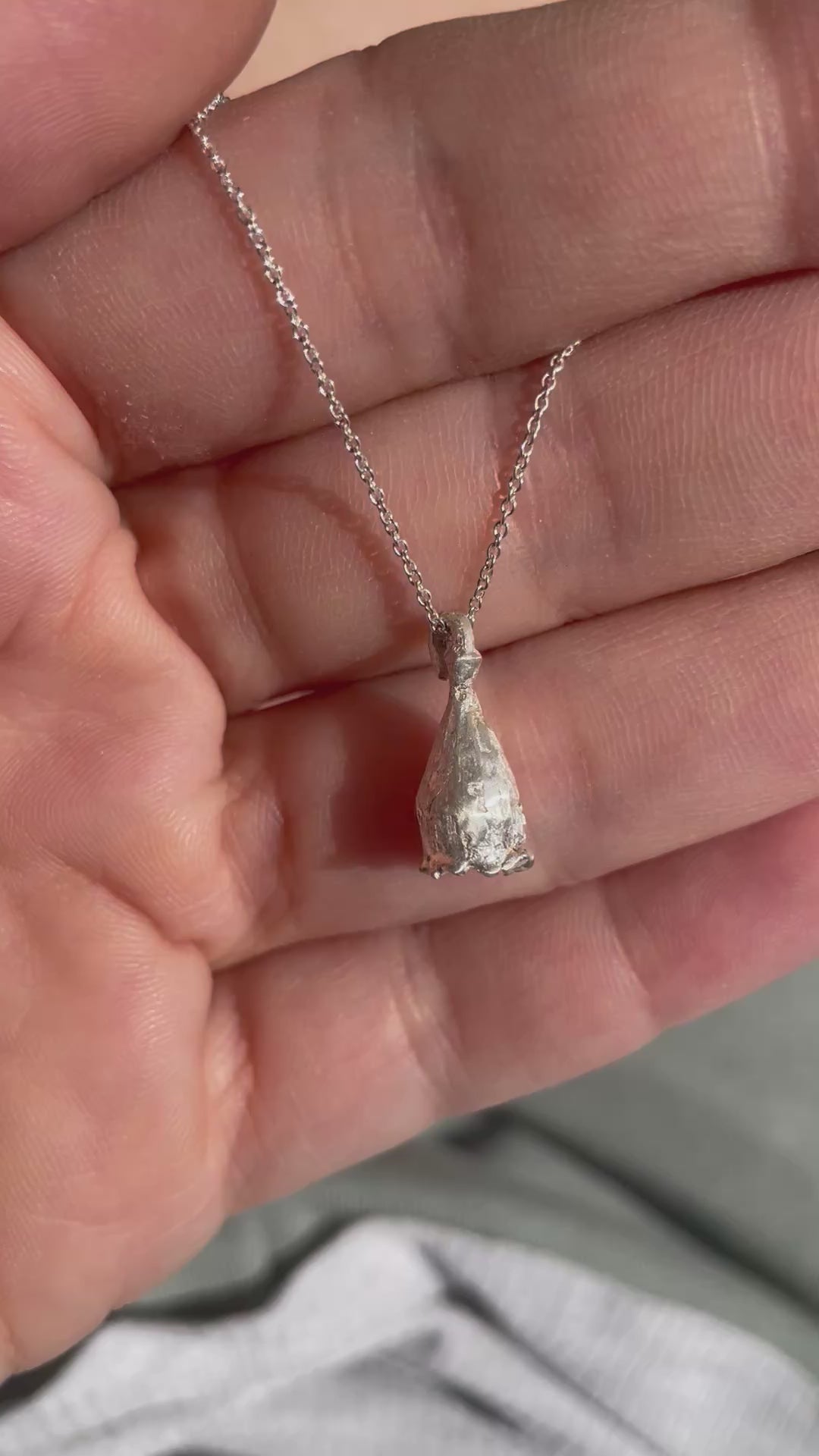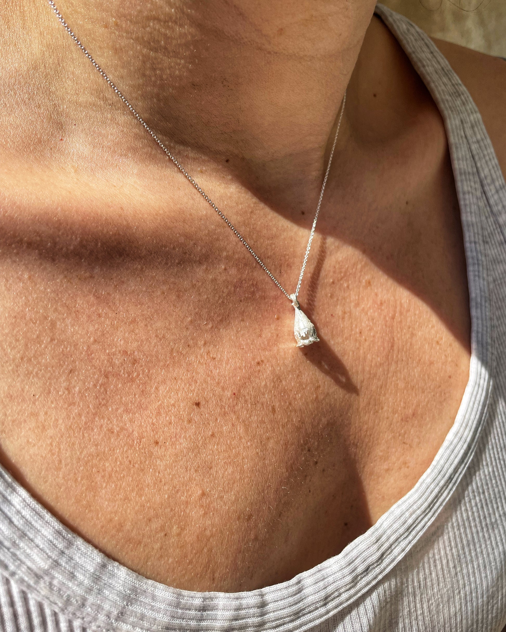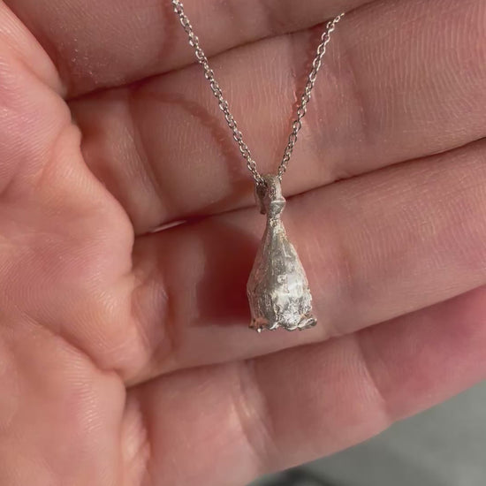 A delicate necklace inspired by the wild beauty of nature. Shaped like a poppy seed pod, this pendant is handcrafted in Sterling Silver 925, with an organic, raw texture that feels as though it was gathered straight from the earth. An effortlessly minimal piece celebrating natural imperfection.