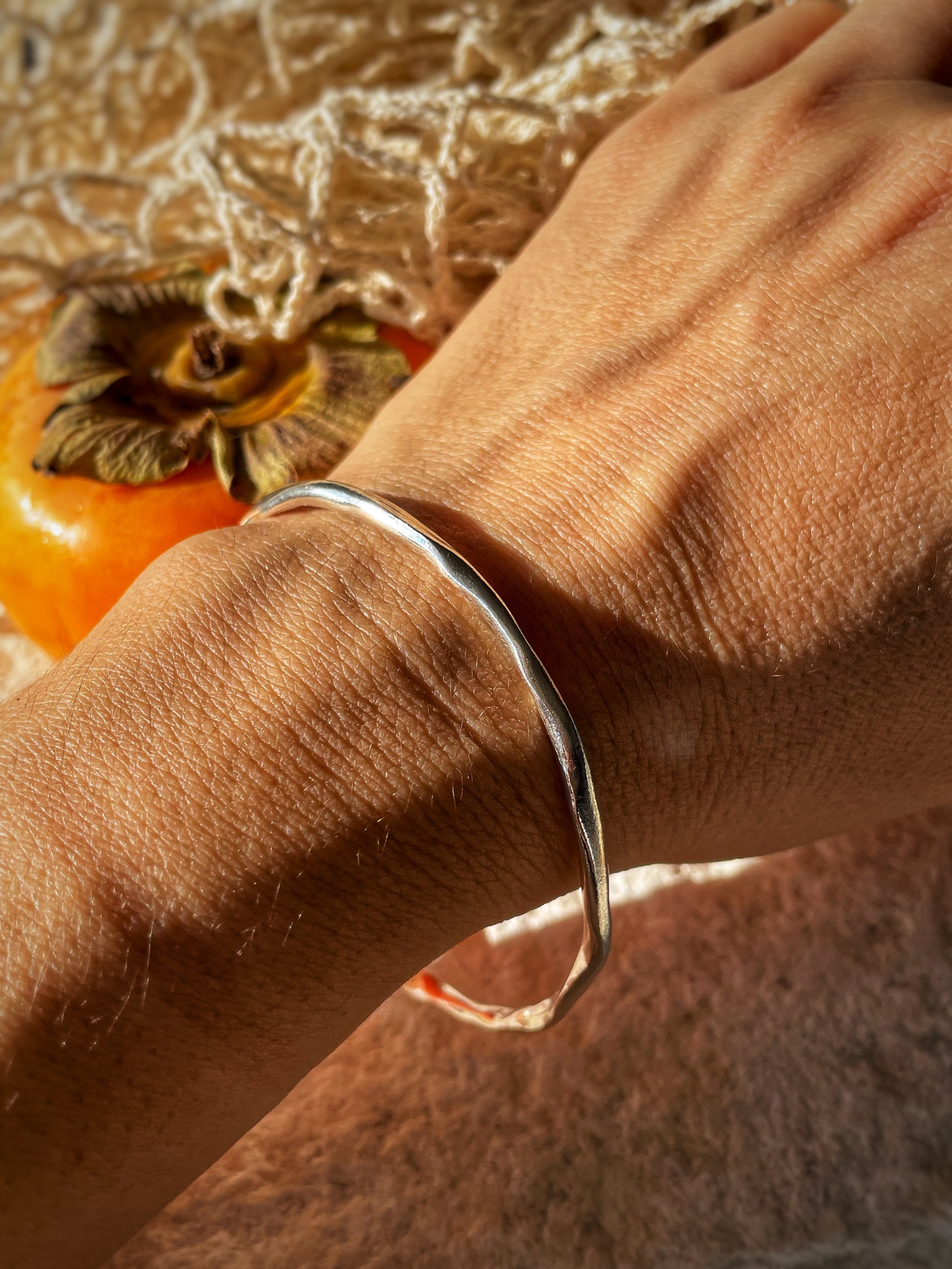 A timeless 925 sterling silver bangle, designed with a modern and minimalist aesthetic. This elegant yet bold piece is perfect for everyday wear or as a unique statement accessory.