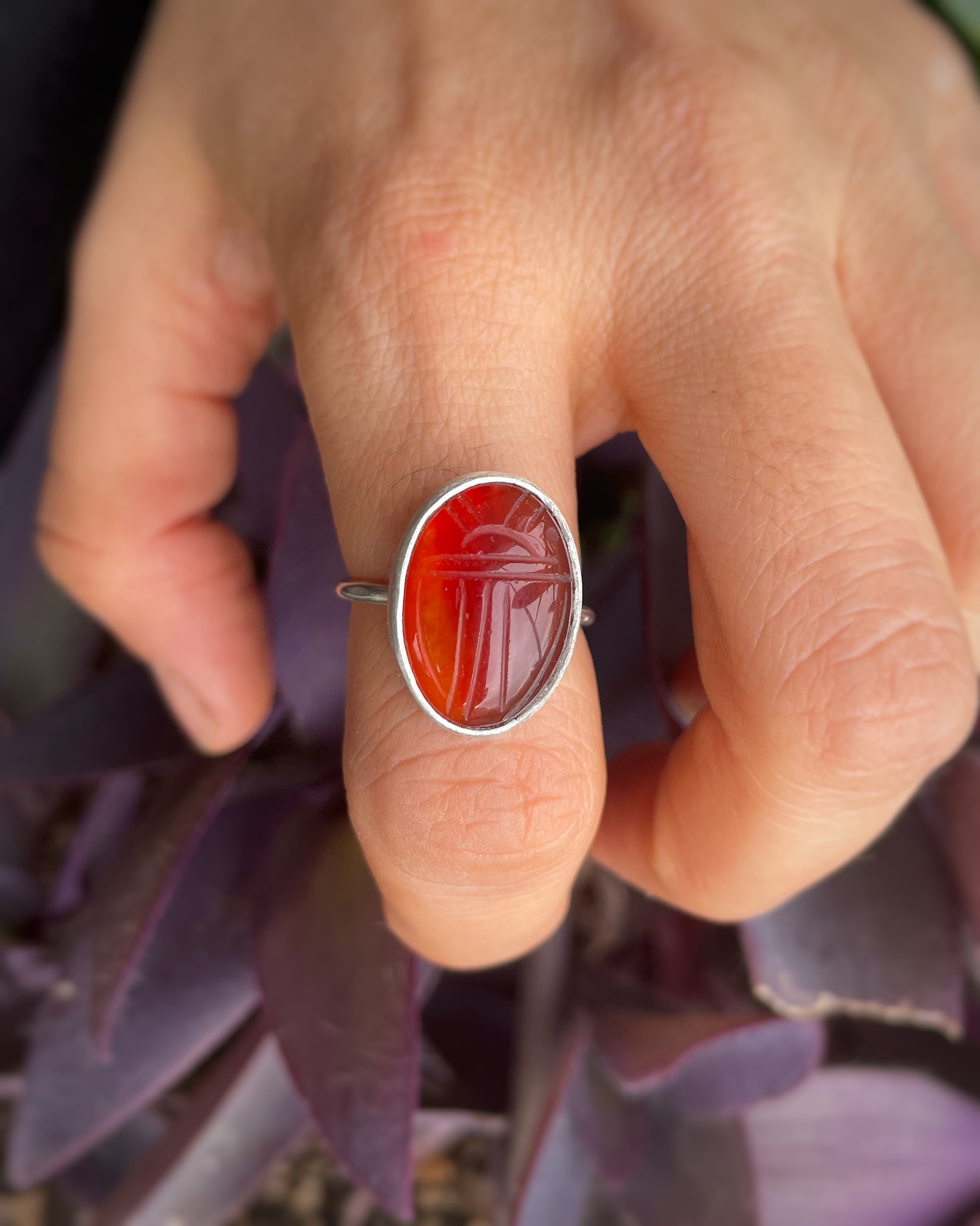 Handmade in sterling silver 925, this ring carries a hand-engraved carnelian scarab — a symbol of rebirth and protection in ancient Egypt. Each piece is one of only three available, making it as rare as it is timeless. The open band adjusts gently to fit US sizes 5–7.