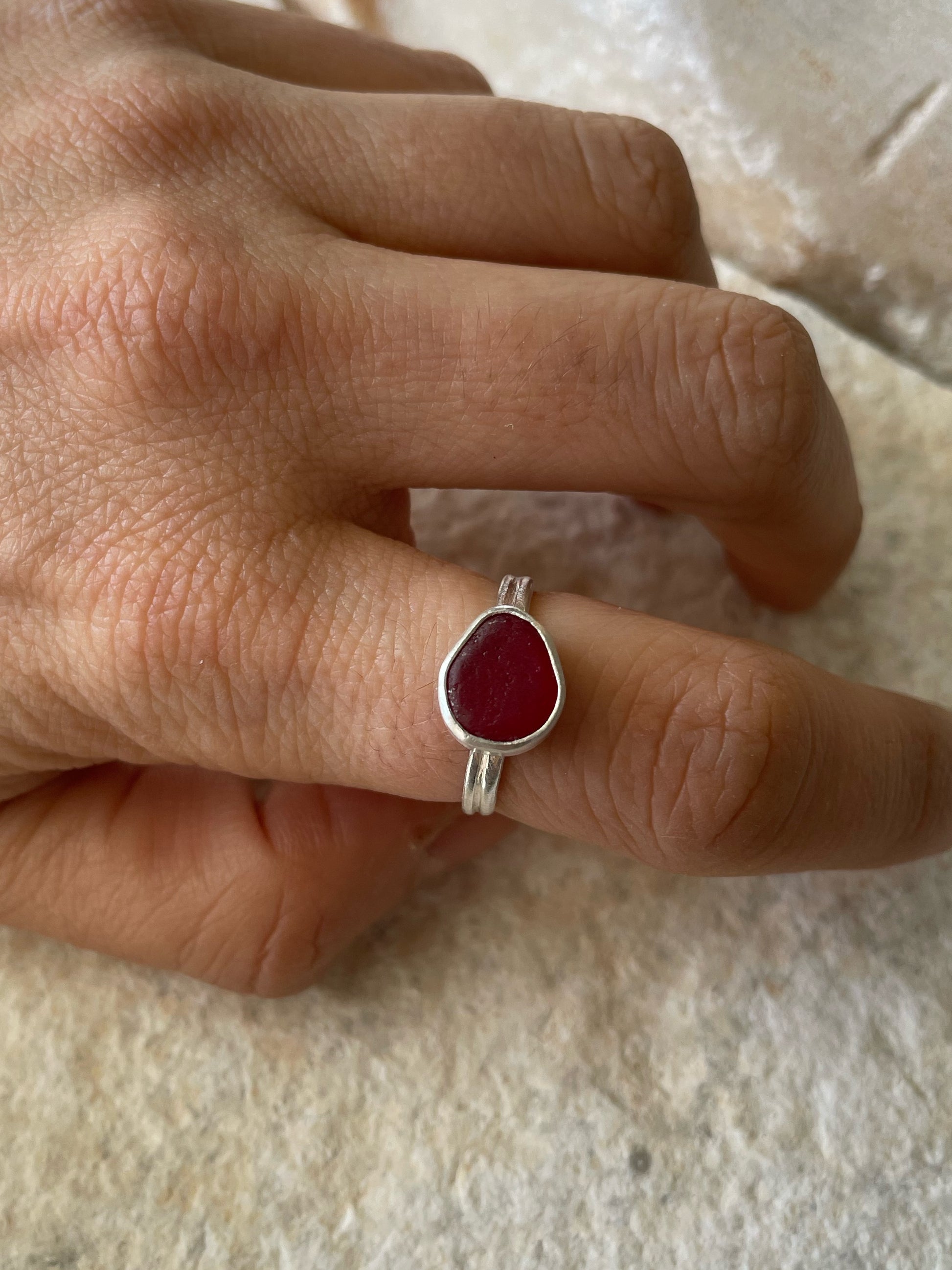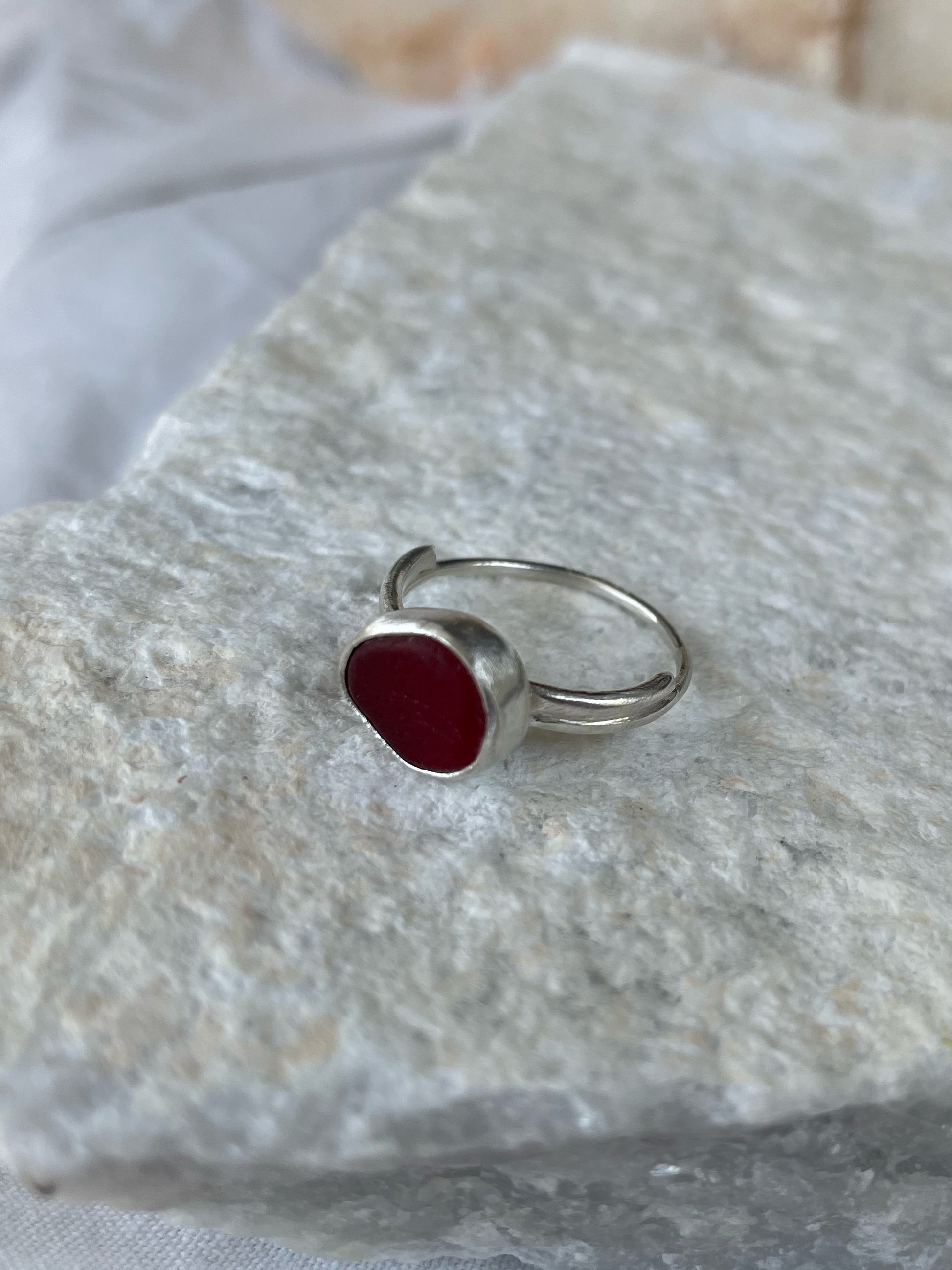 This 925 sterling silver ring features a stunning red beach glass stone, inspired by the ocean's natural beauty. A perfect minimalist design to capture the spirit of summer and the sea, making it a unique addition to your jewelry collection.