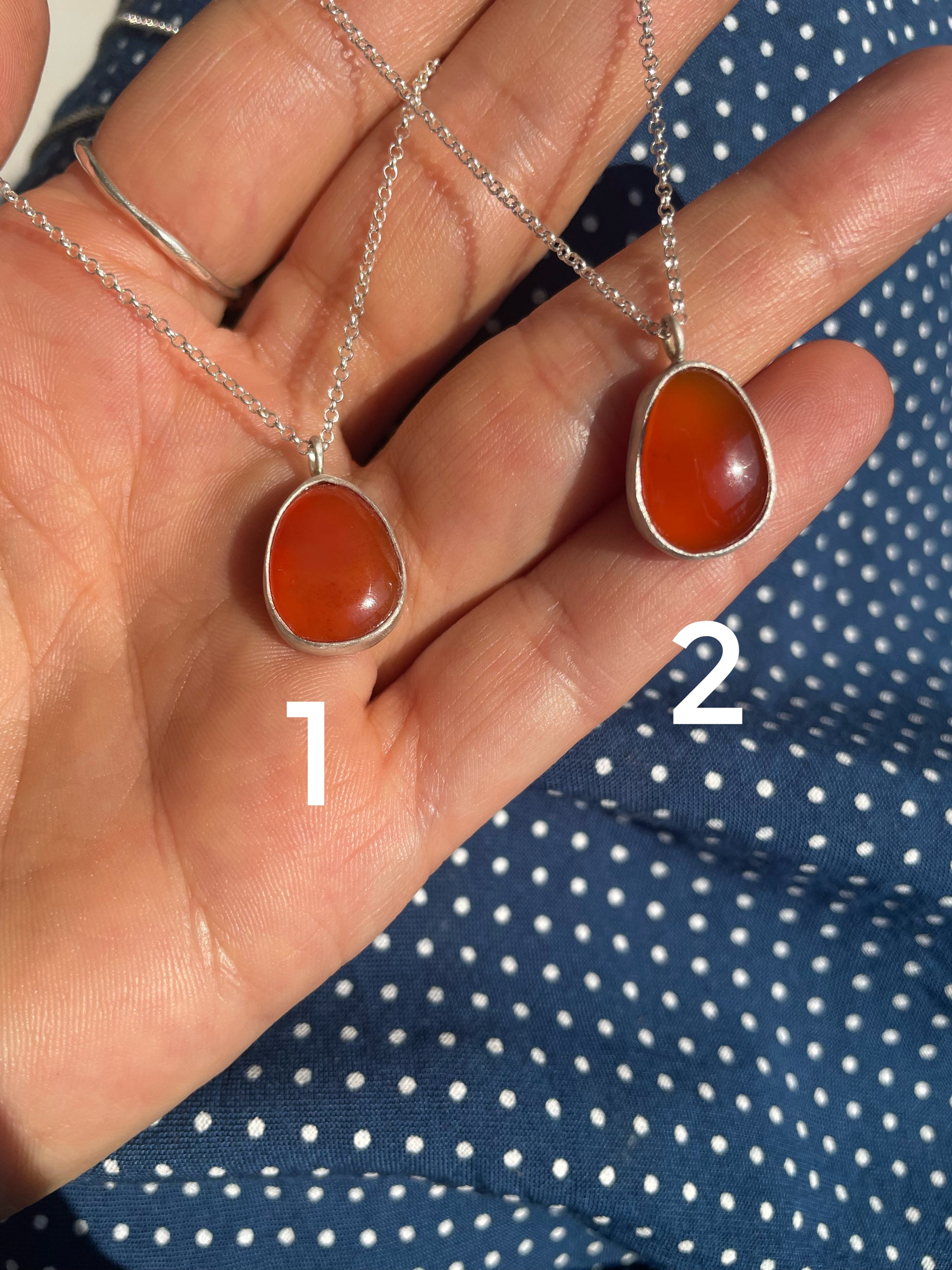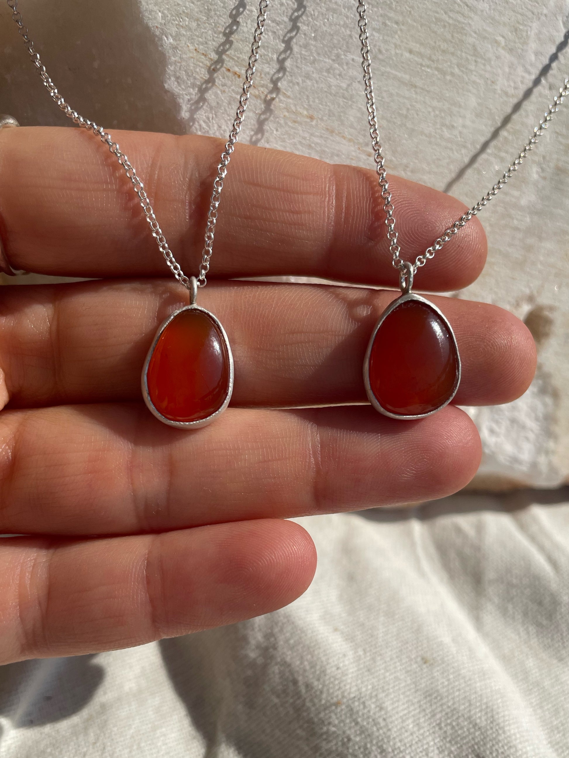 Handmade Carnelian pendant necklaces, featuring two unique natural Carnelian stones set in sterling silver bezels. Their minimalist yet bold design makes them perfect for layering or wearing solo as a statement piece. The natural variations in each stone’s fiery hue make every necklace a one-of-a-kind piece of gemstone jewellery.