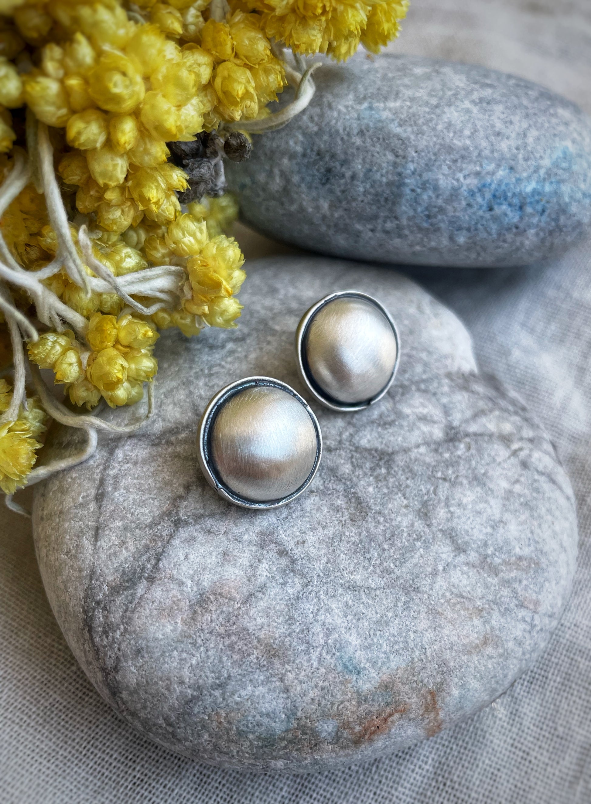 A pair of 925 sterling silver stud earrings with a sleek round shape, featuring a unique combination of matte and oxidized finishes. These modern, stylish earrings are perfect for adding a minimalist touch to any look.