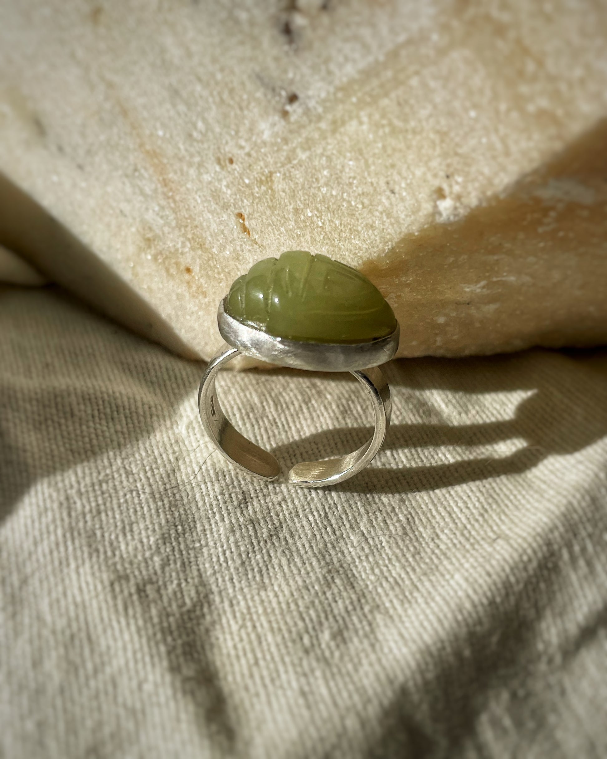 A handmade sterling silver ring with a hand-carved jade scarab, symbol of protection, rebirth, and strength.