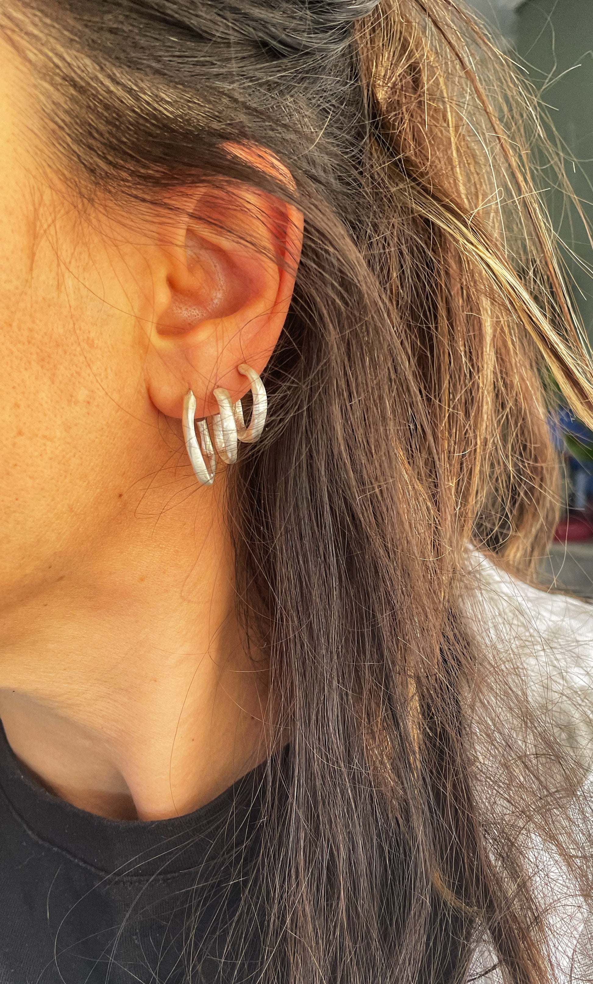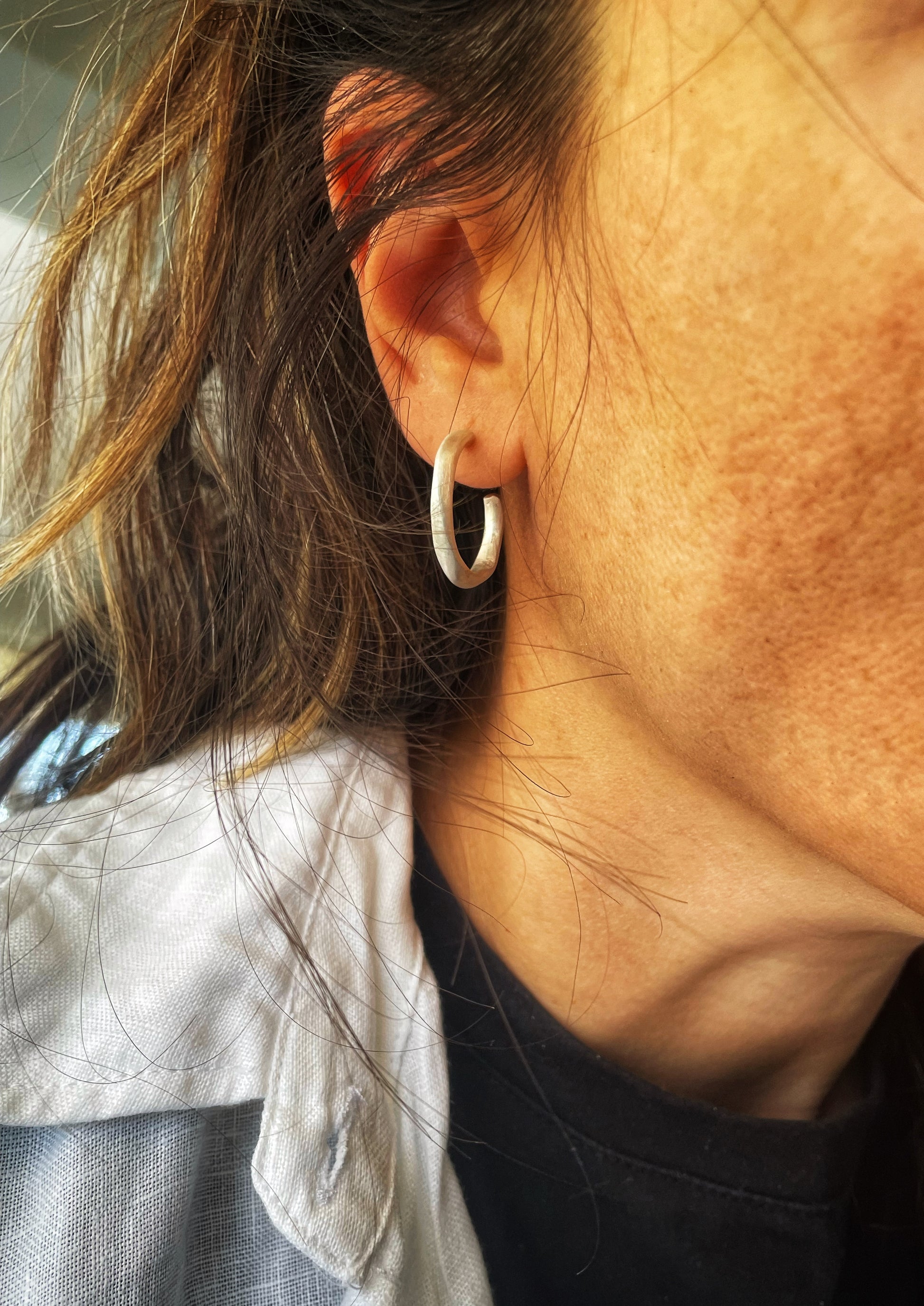 These irregular silver hoops blend modern design with effortless elegance. Available in small and large sizes, they offer a unique twist on the classic hoop earring, perfect for everyday wear or special occasions.