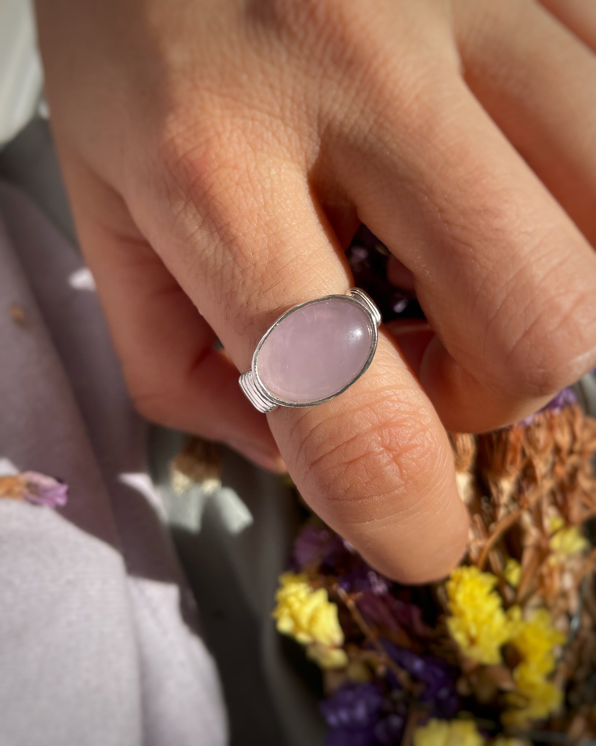 A handcrafted sterling silver ring with a smooth, pale amethyst stone that glows softly under the light.