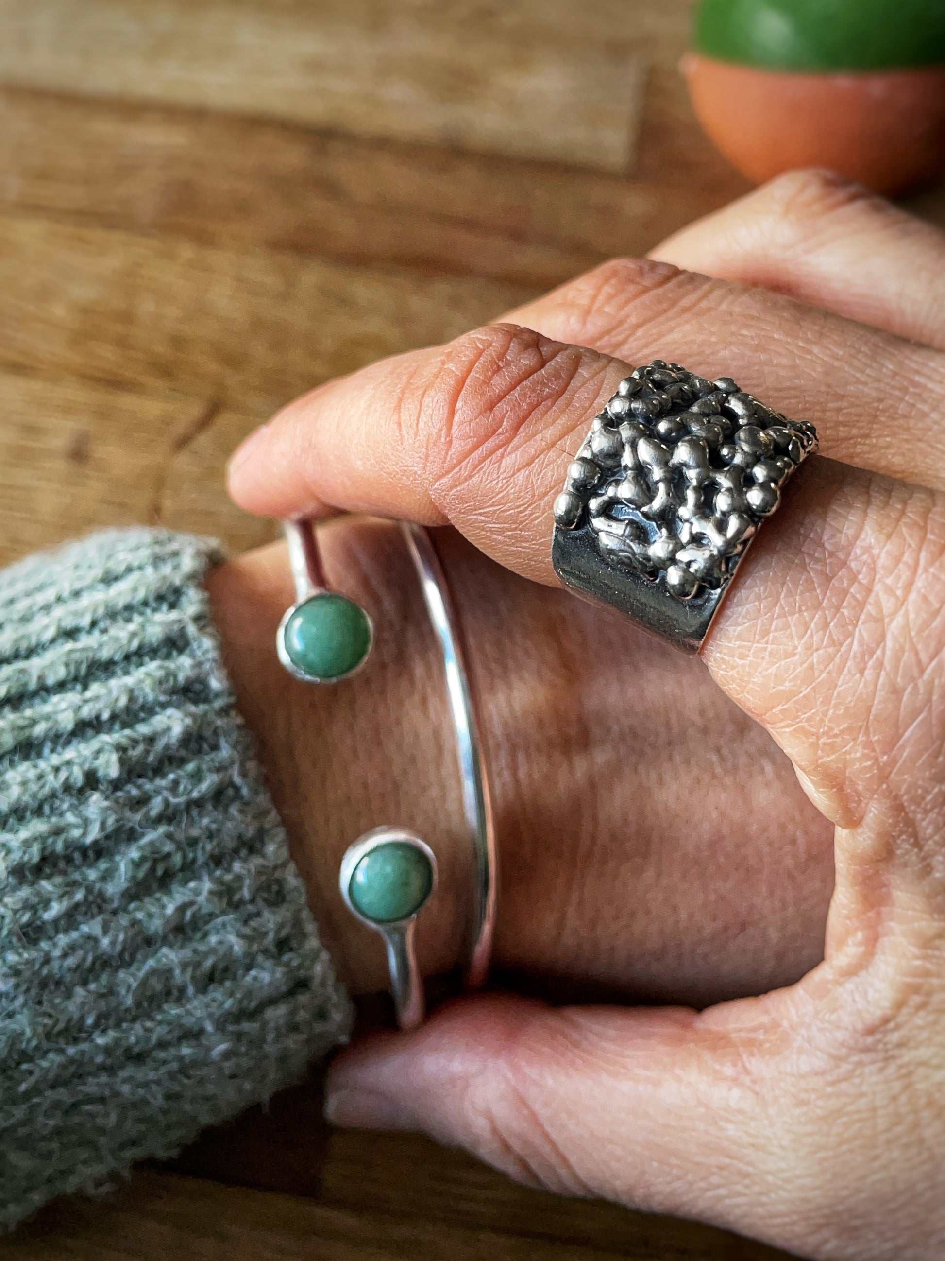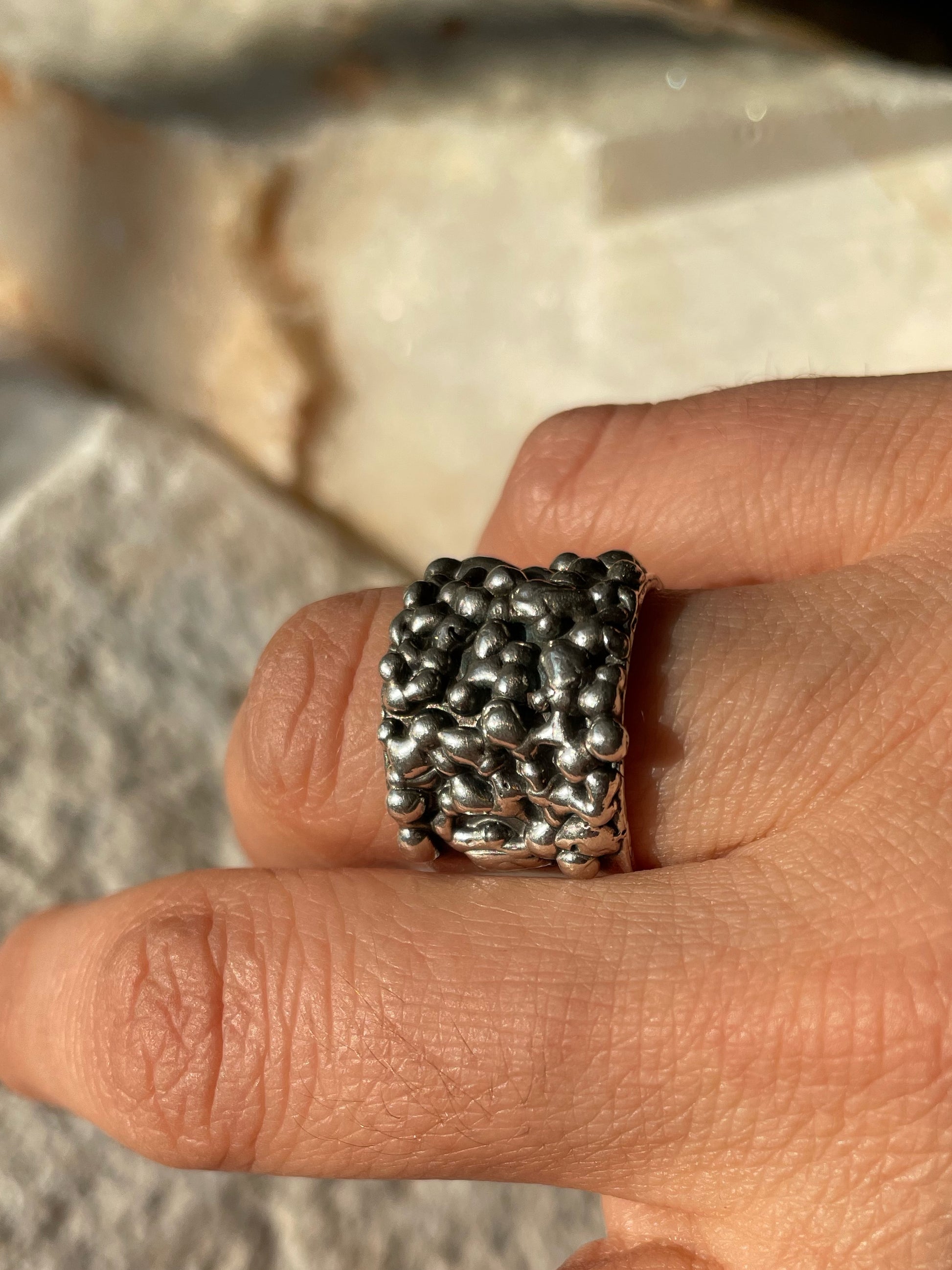 The Stalagmite Ring is a bold and artistic statement piece, featuring a wide, adjustable design with an oxidized finish for a vintage, rustic appeal. The wide band features intricate, stalagmite-like details at the upper part, creating a striking organic texture that stands out. The ring has been oxidized to enhance its depth and give it a vintage yet modern aesthetic.
