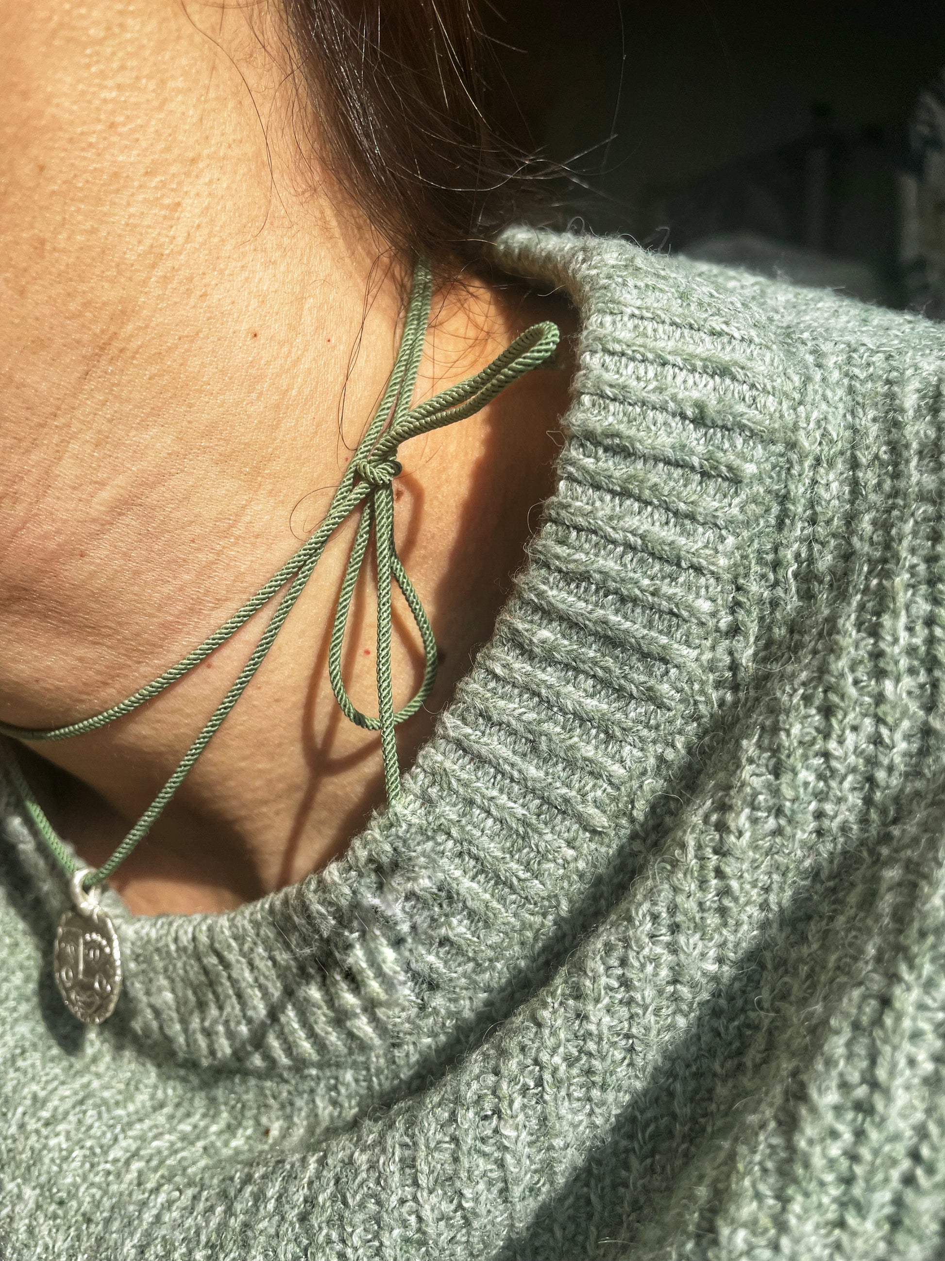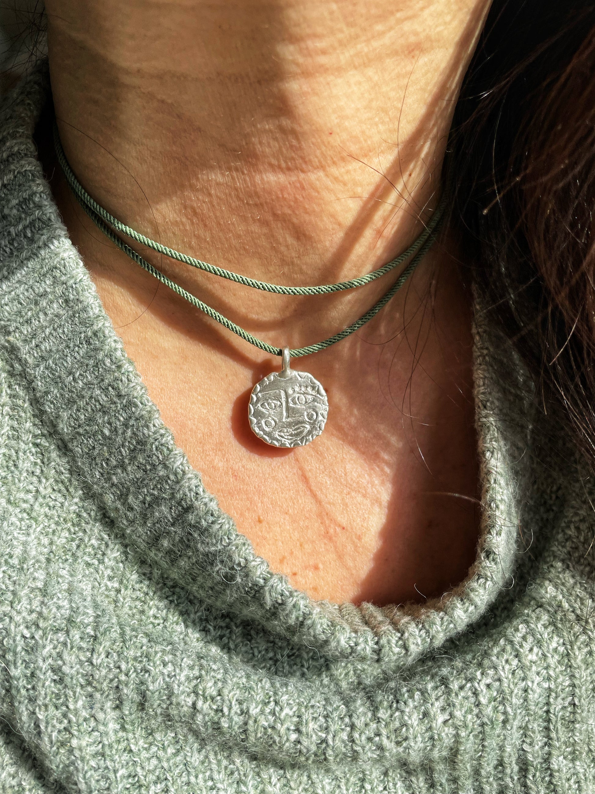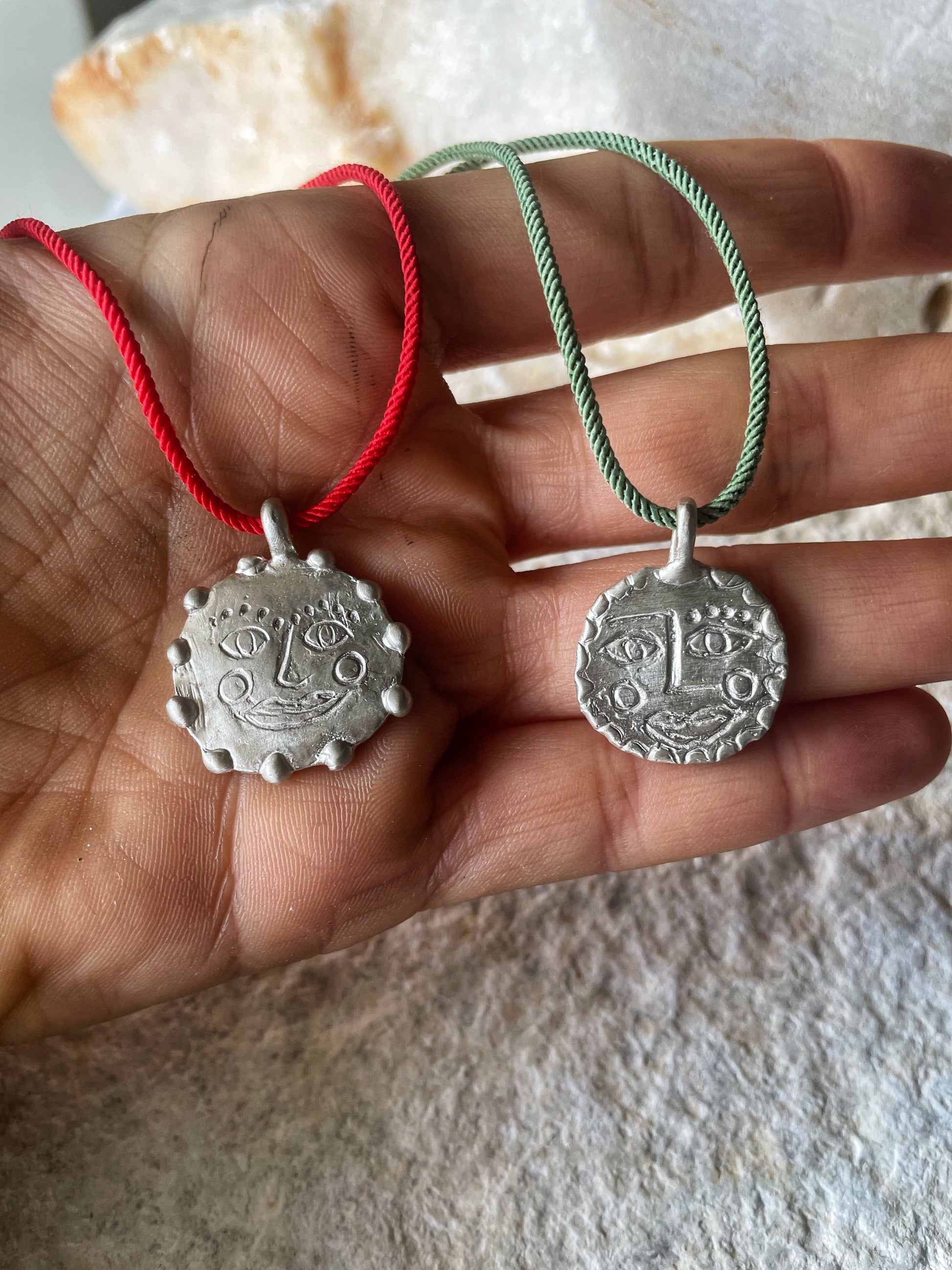 Each pendant is hand-engraved, giving it a unique, artisanal touch. Suspended on an adjustable string, this choker lets you choose between red or green.
