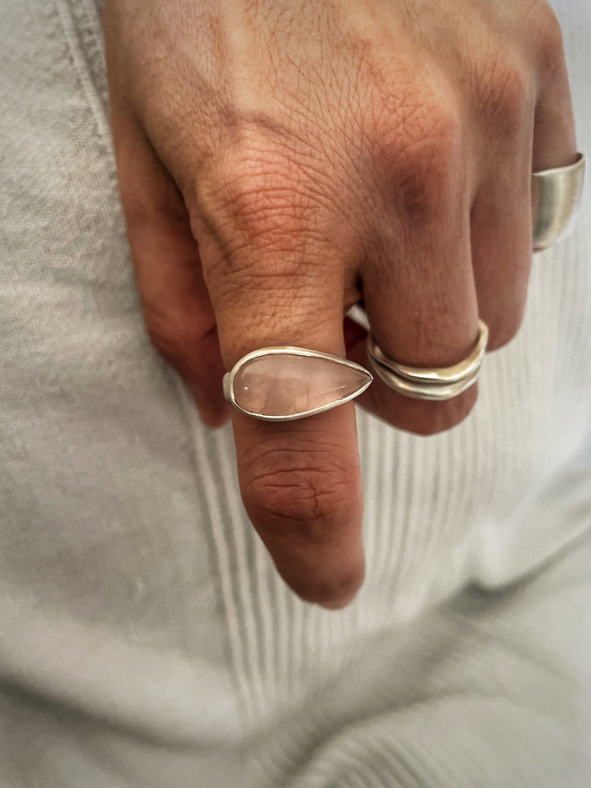 Elegant and timeless, this teardrop-shaped Rose Quartz ring is handcrafted to highlight the natural beauty of the gemstone.