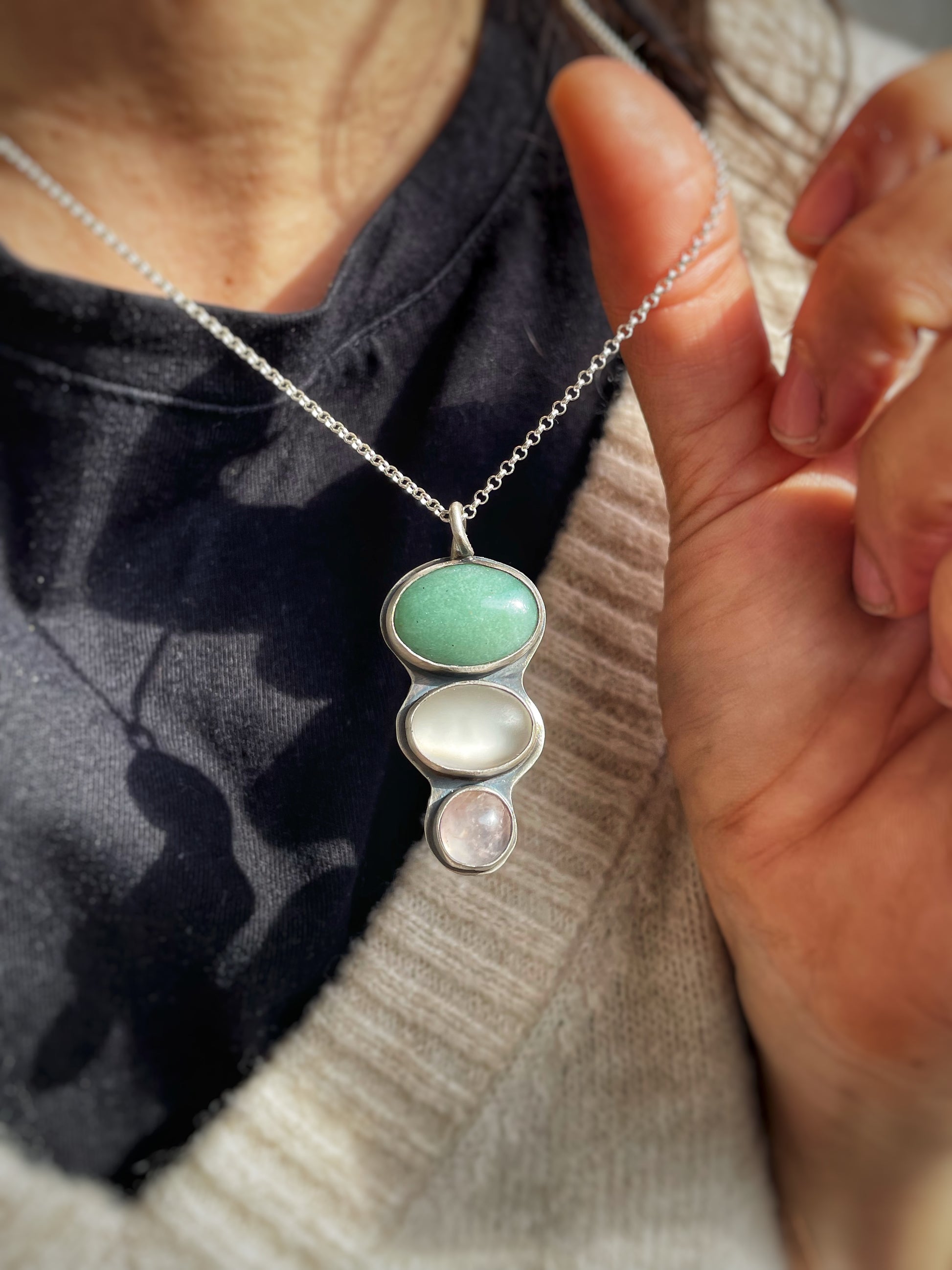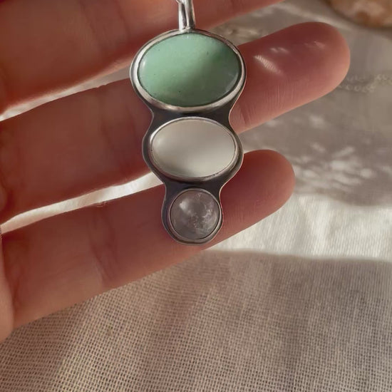This handcrafted statement necklace features a 925 sterling silver pendant adorned with Aventurine, White Sea Glass, and Rose Quartz. The oxidized patina finish enhances its modern, boho aesthetic, making it a truly unique piece. A bold yet elegant accessory, perfect for those who appreciate artisanal jewelry.