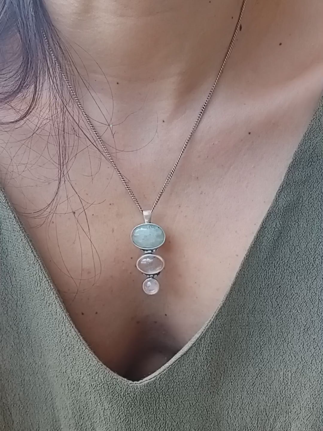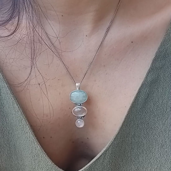 This one-of-a-kind handmade pendant features a beautiful combination of three stones: Aventurine, Morganite, and Rose Quartz, set in sterling silver. Each stone is carefully chosen for its natural beauty and energy, creating a truly special piece that stands out with its vibrant colors and meaning.