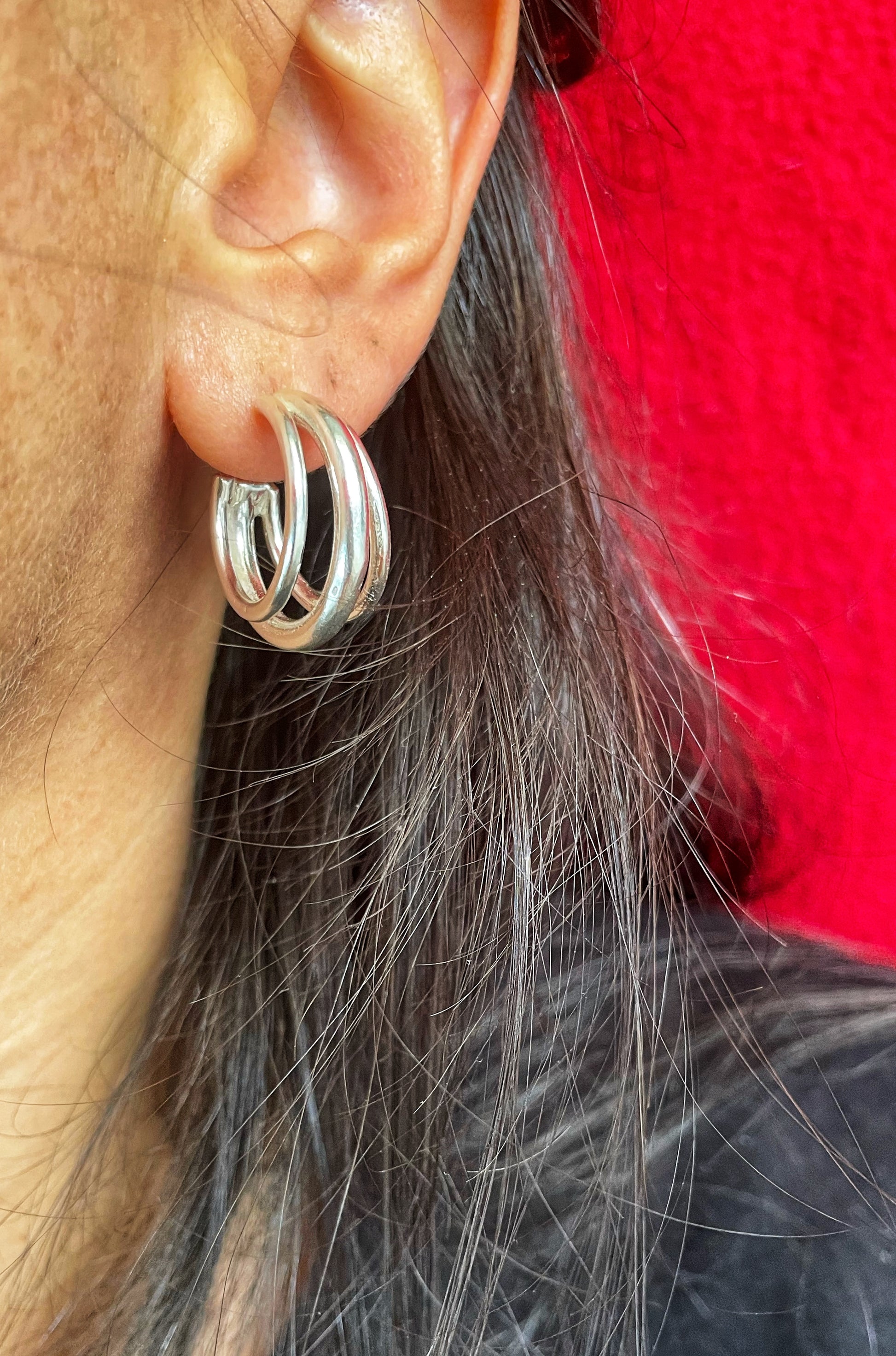 These bold 925 sterling silver triple hoop earrings combine three hoops into one unique, modern design. Perfect for those who love minimalist yet statement-making pieces, these earrings bring a chic and chunky feel to your look.