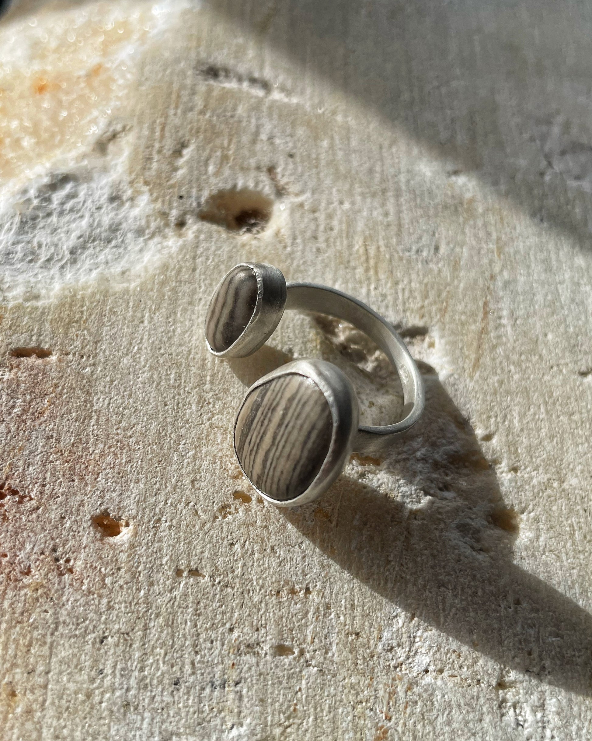 A unique open ring handcrafted in sterling silver 925, featuring two natural pebbles personally collected from the island of Karpathos. Its raw, earthy texture blends beautifully with the soft matte silver, creating an effortlessly organic and minimal look. Each pebble is hand-set, making this ring truly one of a kind.